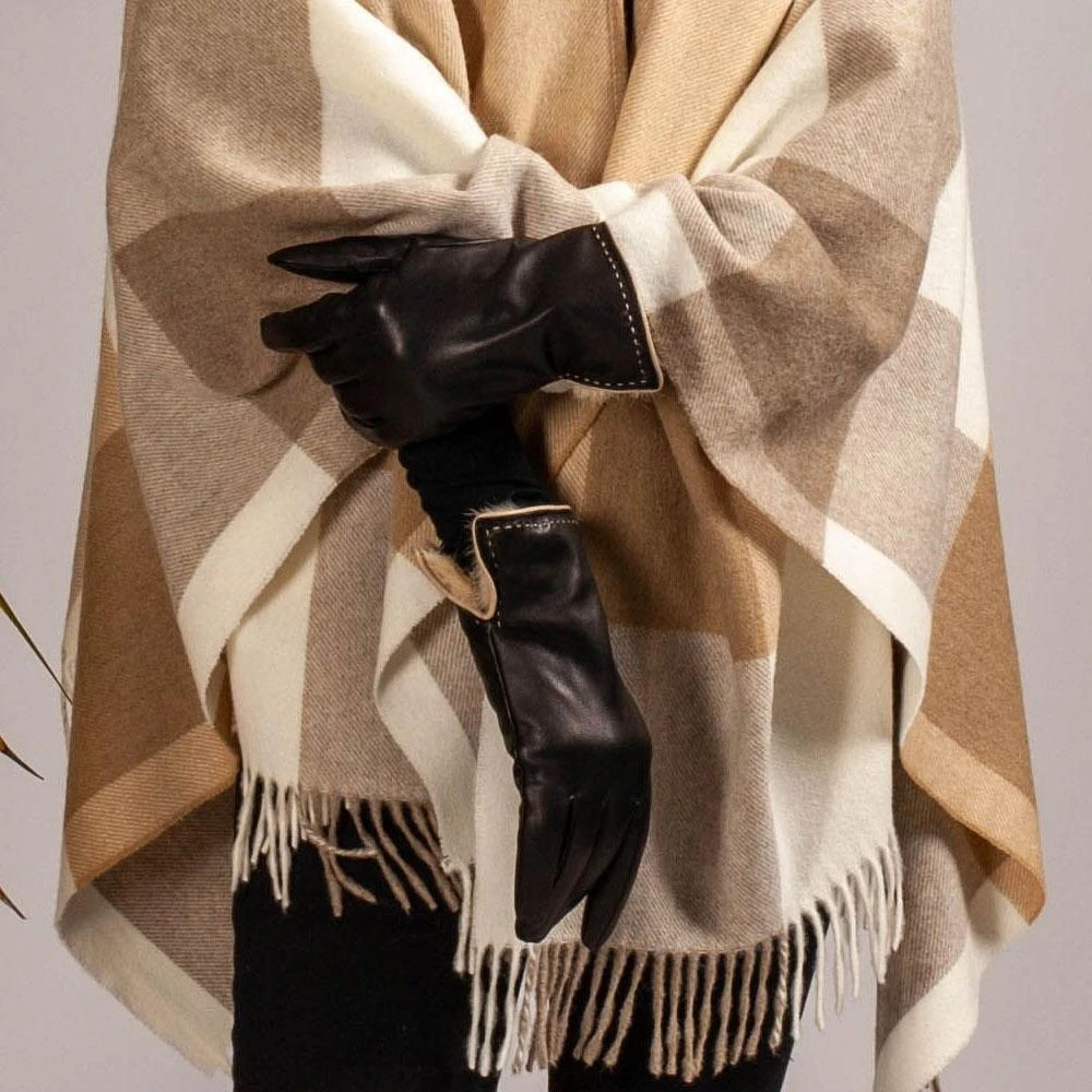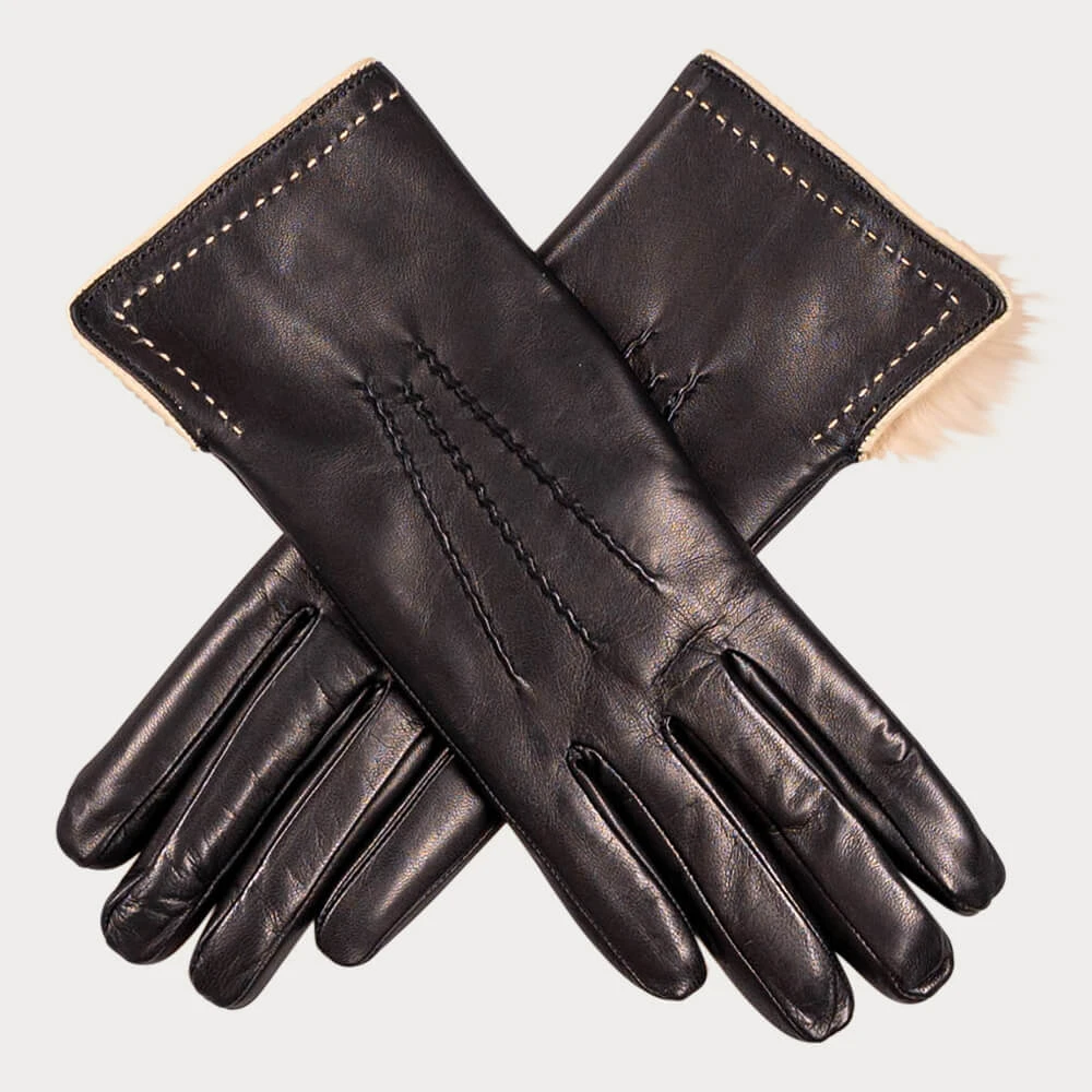These luxuriously soft and warm ladies black and brown rabbit fur lined leather gloves are seasonal favourites. The softest black Italian leather is lined with cappuccino toned rabbit fur and the contrast piping and stitching detail matches the colour of the fur lining resulting in an elegant yet practical glove. The three points give the gloves a polished finish. The cuff finishes 5 cm (2 in) above the wrist for extra warmth and the glove measures 24 cm (9.5 in) from the tip of the middle finger to the cuff. A small vent at the wrist allows for the cuff to be turned back to reveal the contrast fur.