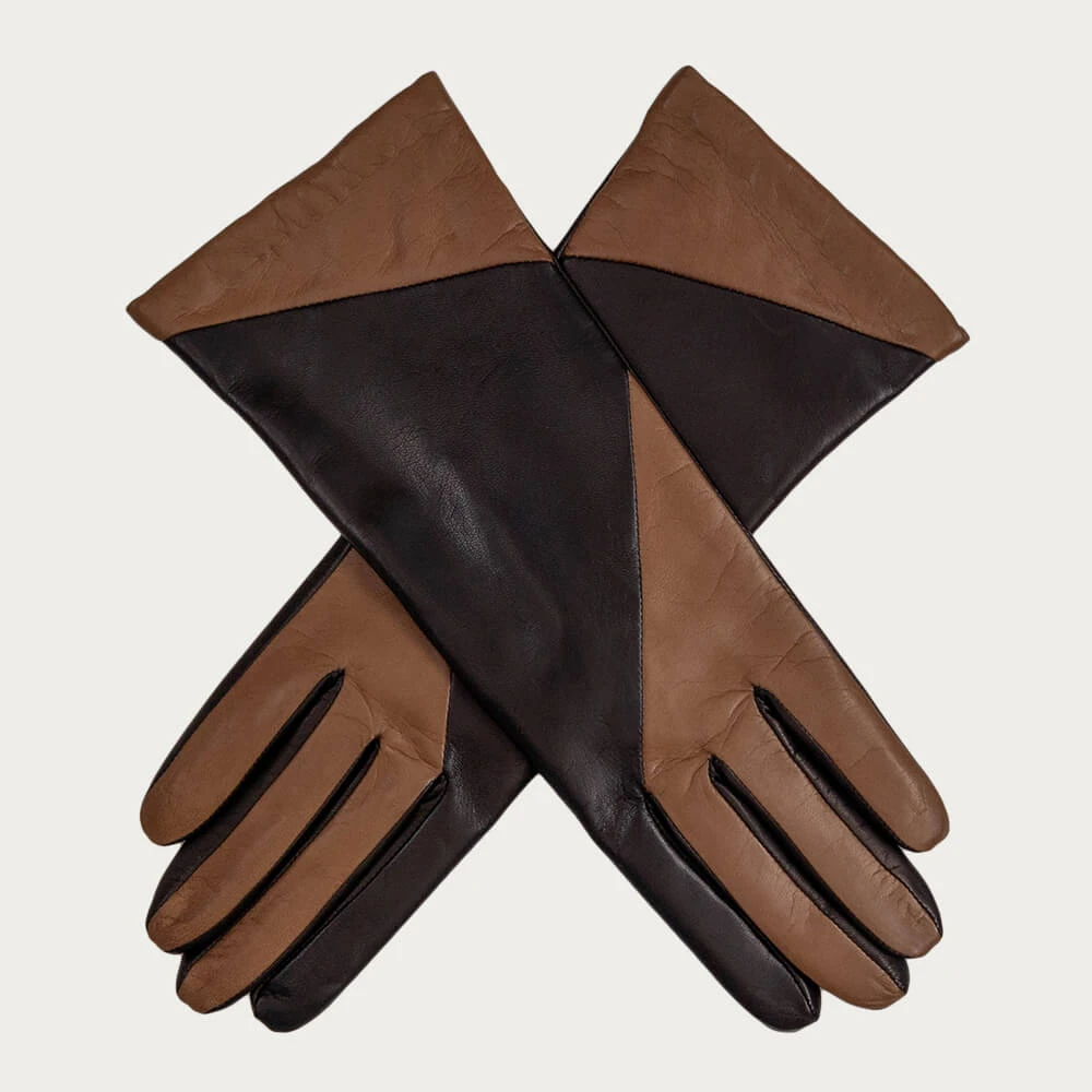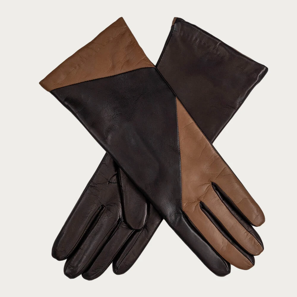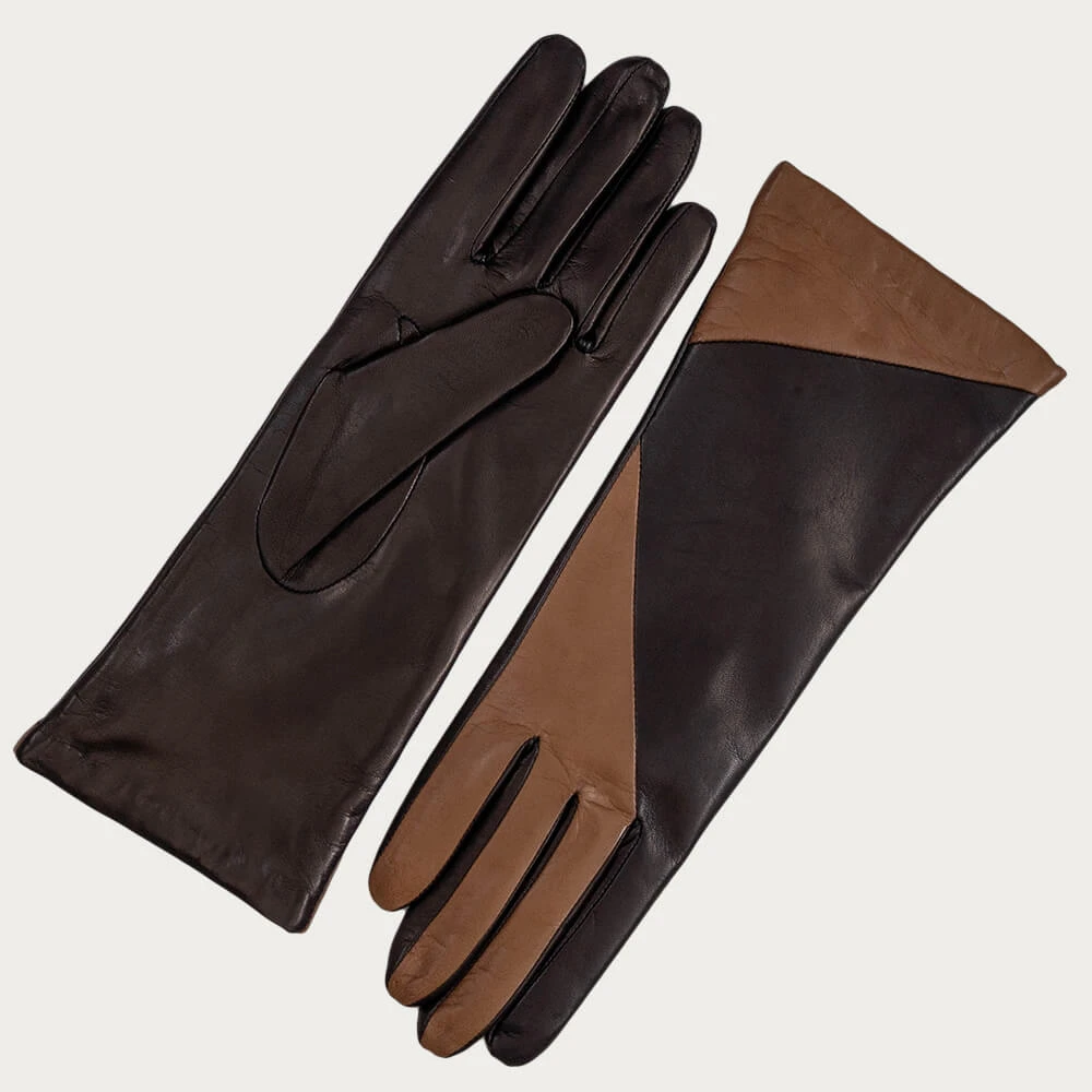 Sleek and chic these elegantly styled longer length gloves are crafted in Italy from buttery soft nappa leather. The two- tone treatment of black and taupe is seamlessly executed to create an elegant but practical glove. The palm side is in plain black creating the subtle duo tone effect at the fingers. Cashmere lined for guaranteed warmth and comfort they extend well above the wrist for added warmth.