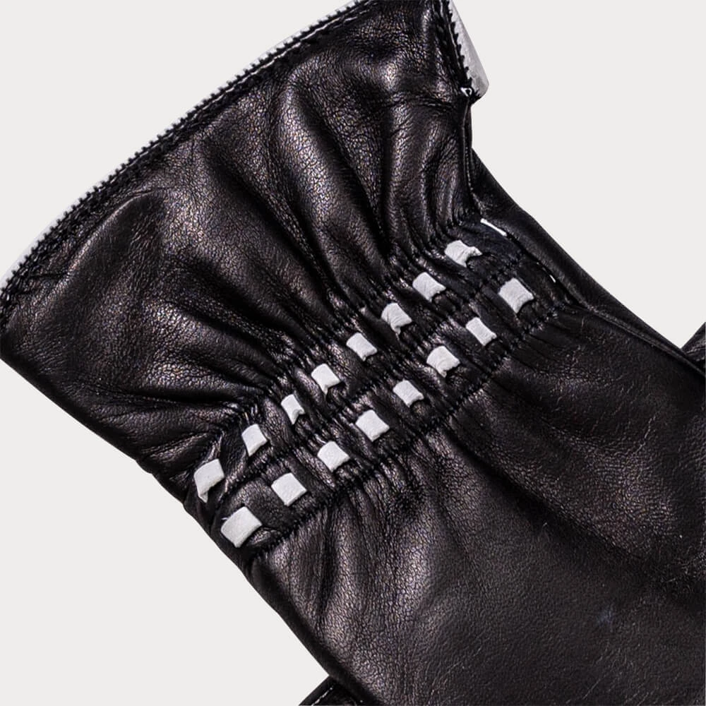 The white stitching detail on these gently gathered black Italian leather gloves gives them a cute point of difference. Expertly made in Italy from ultra soft nappa leather they are finished with white piping and fully lined with 100% cashmere for guaranteed warmth.