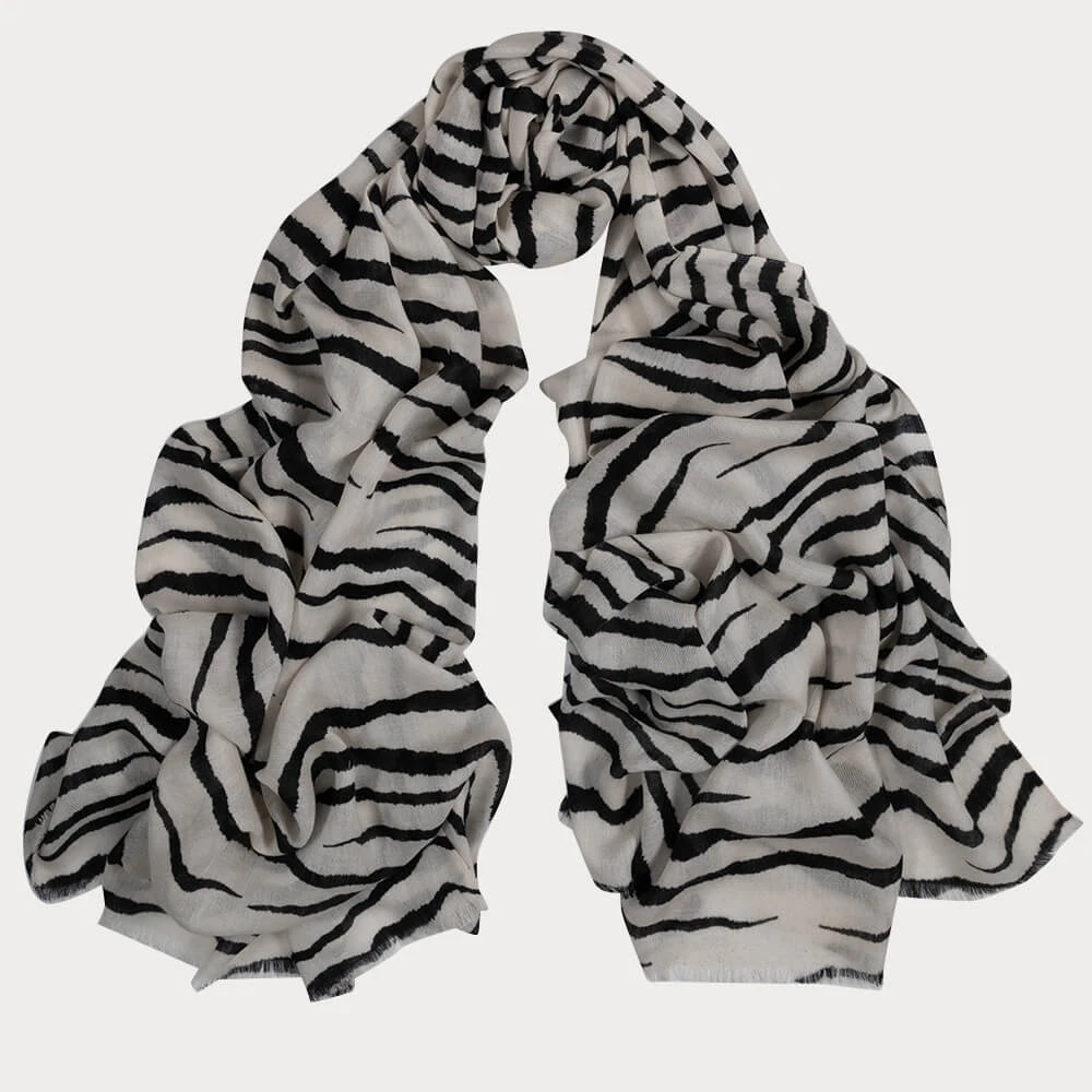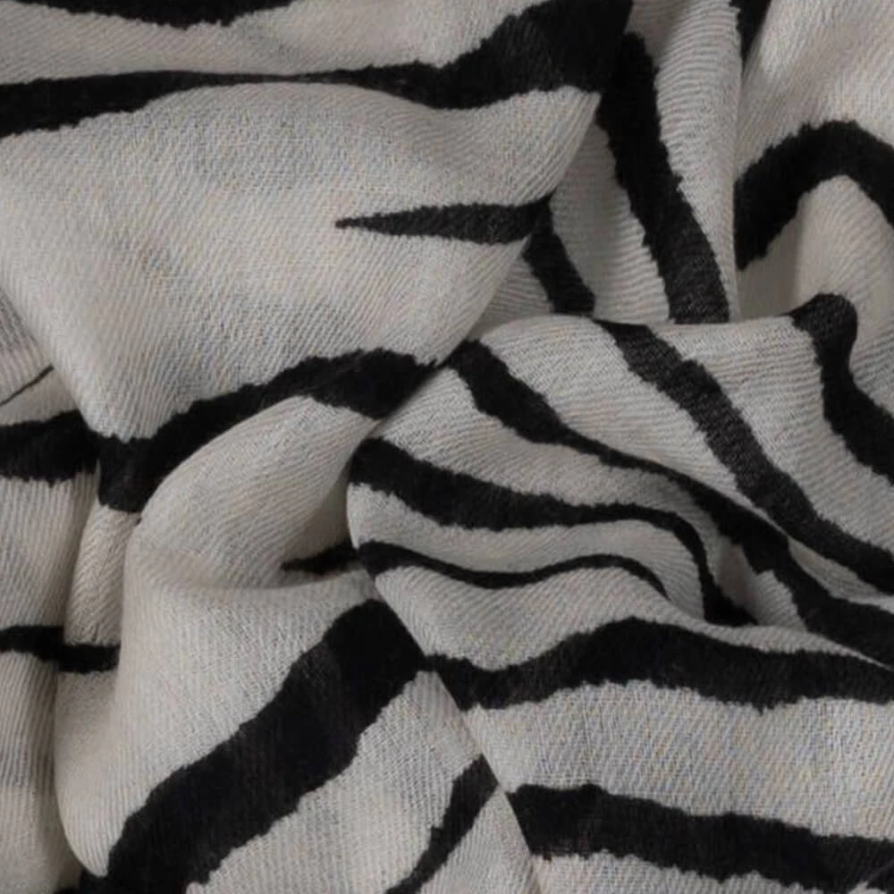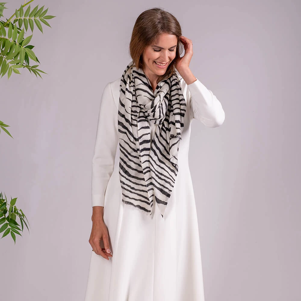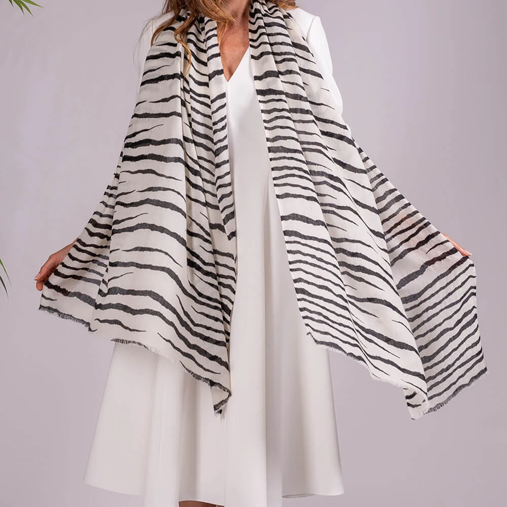 Ever popular, animal prints find favour all year round with our customers. This zebra print wrap in monochrome tones of black, and white is soft, warm and light and adds impact to black wardrobe staples. Hand crafted from a clever blend of cashmere and silk, it has a delicate, subtle sheen from the silk in the fabric. Generously sized at 200 x 70cm it is versatile and can be worn asashawl or scarf and even a sarong. It is finished with short fringing.