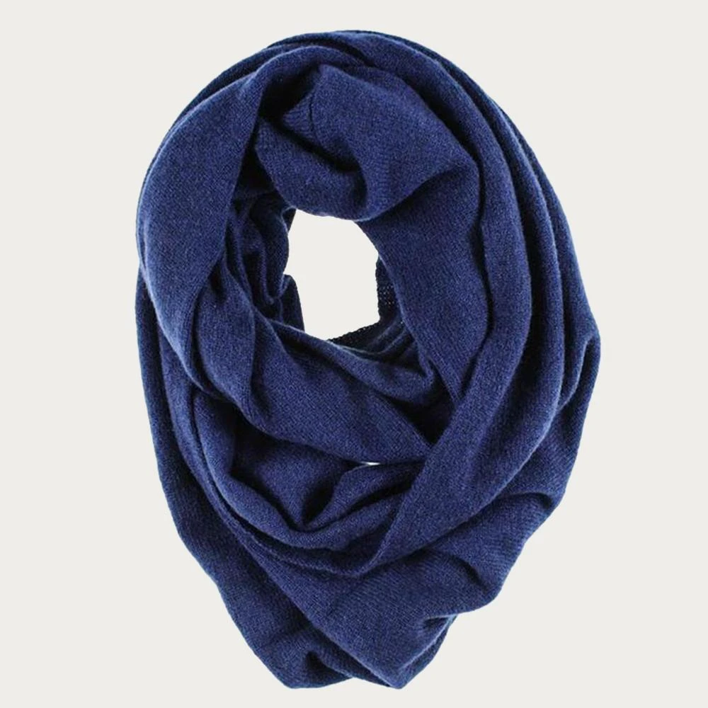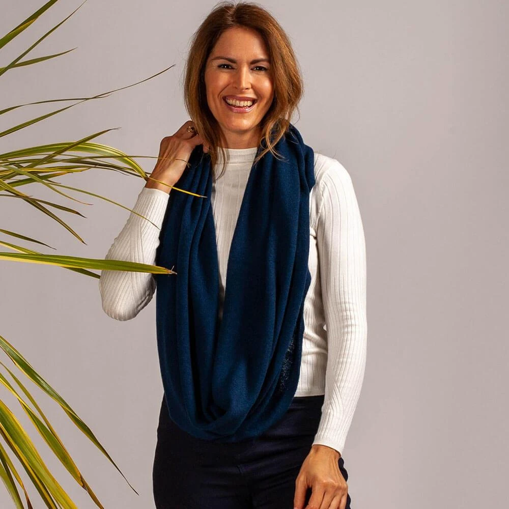 Knitted from downy soft Italian cashmere this large navy cashmere snood in a midnight navy tone can be worn singly as a long slouchy snood, or doubled as an extra warm neck warmer and collar. Loop it over sweaters and jackets to stay cosy and ultra warm this winter and when really cold pull it up over your head.