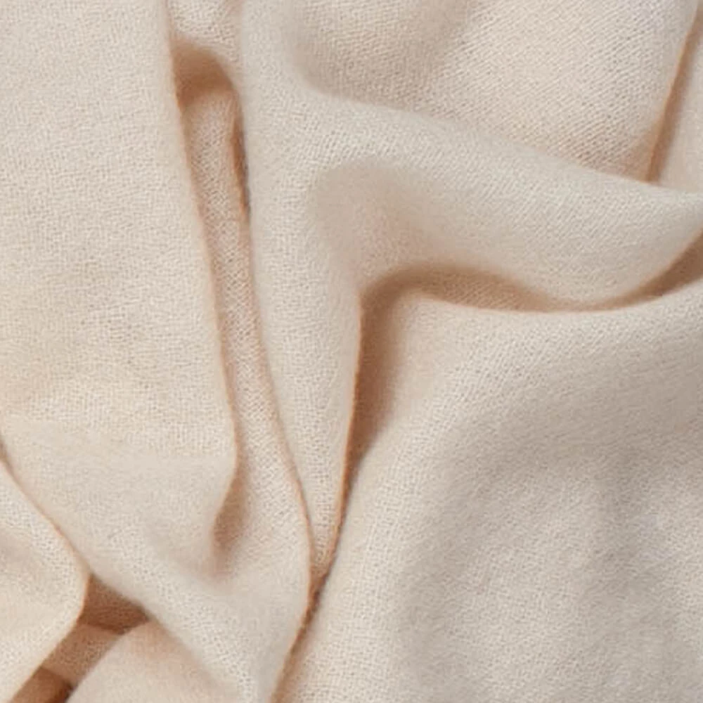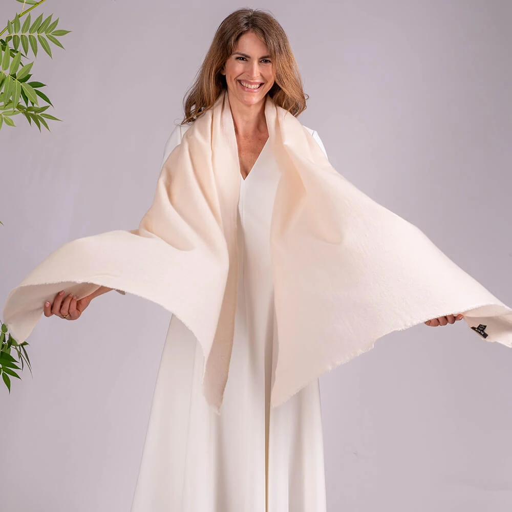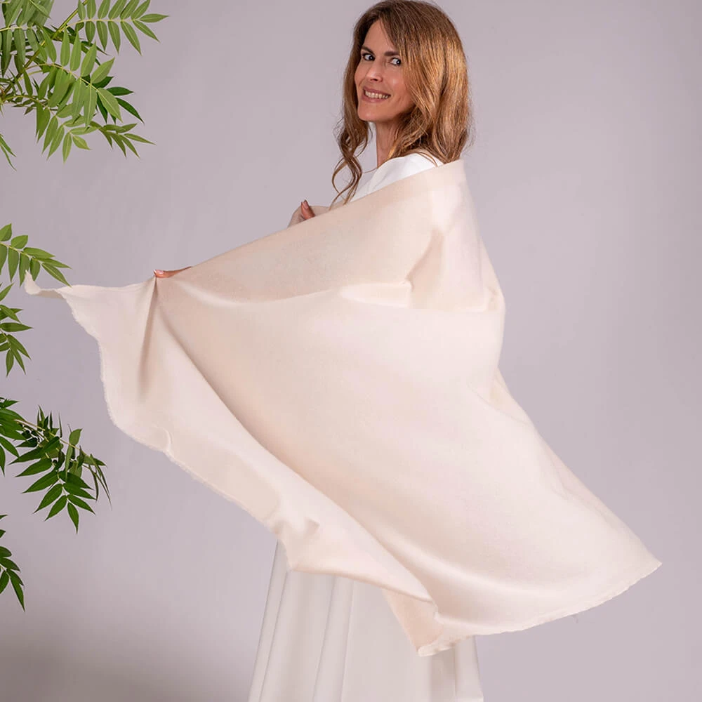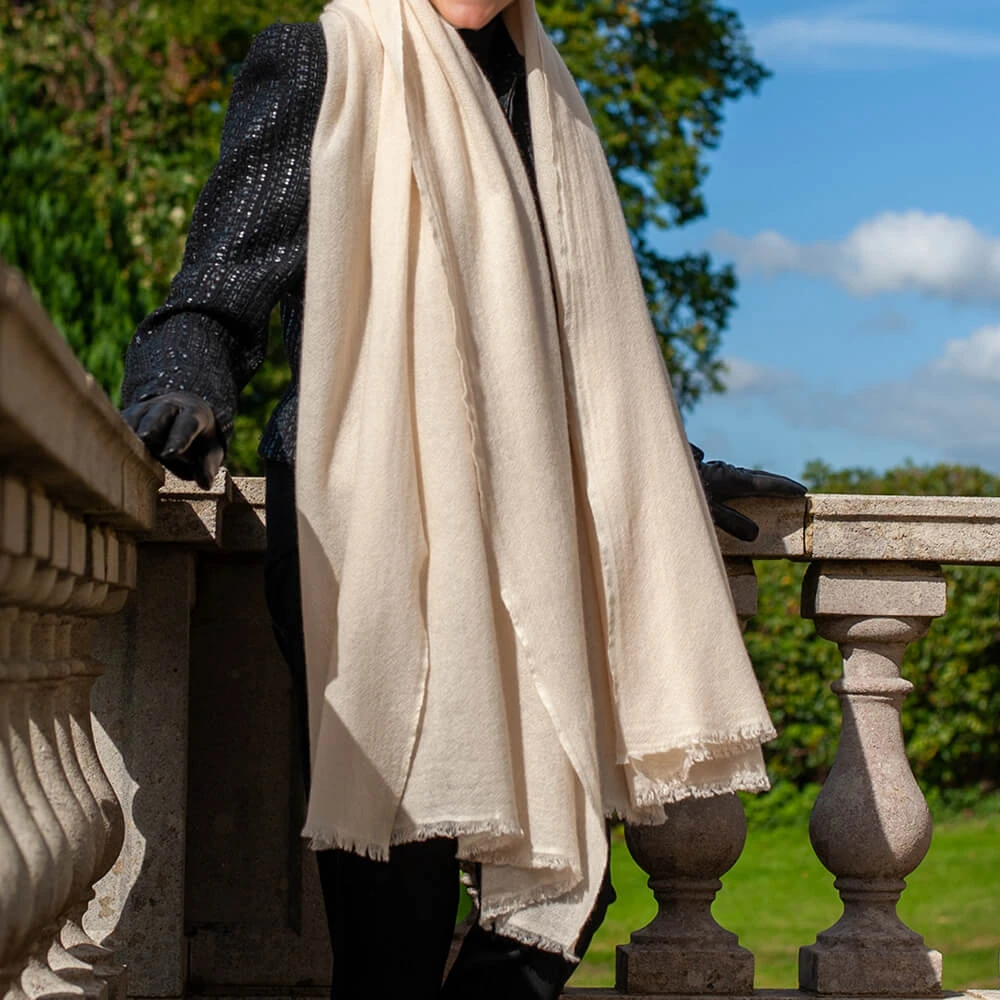 Feminine and flattering this luxurious oversized buttermilk cream pure cashmere shawl (210cm x 105cm) is fine and feather light. Crafted in a casual gauzy weave from pure cashmere it is semi sheer and drapes elegantly in soft folds. Ultra soft and light it is cool in summer worn as a wrap and warm in winter tied as a luxurious scarf. Perfect for travelling too, it packs neatly away. Short eyelash fringing gives it a chic finish.