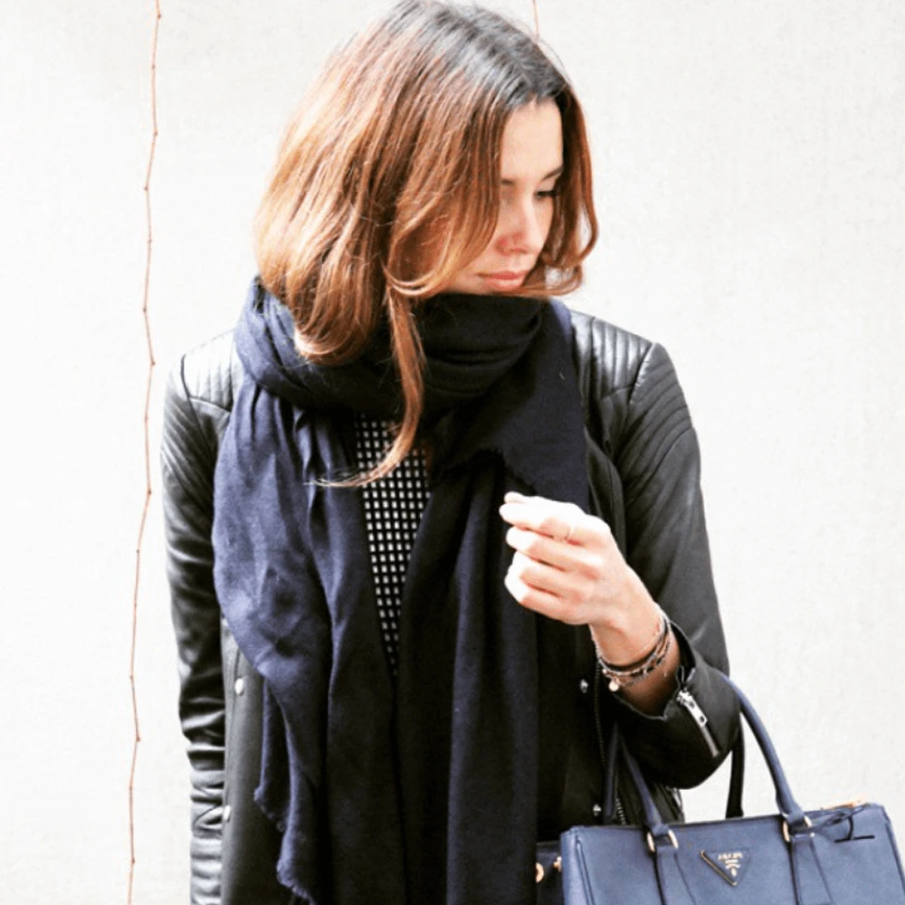 Classic jet black cashmere shawl made from finest hand-spun and hand-woven cashmere. A wardrobe essential it is a versatile accessory and marries effortlessly to neutrals as well as brights.