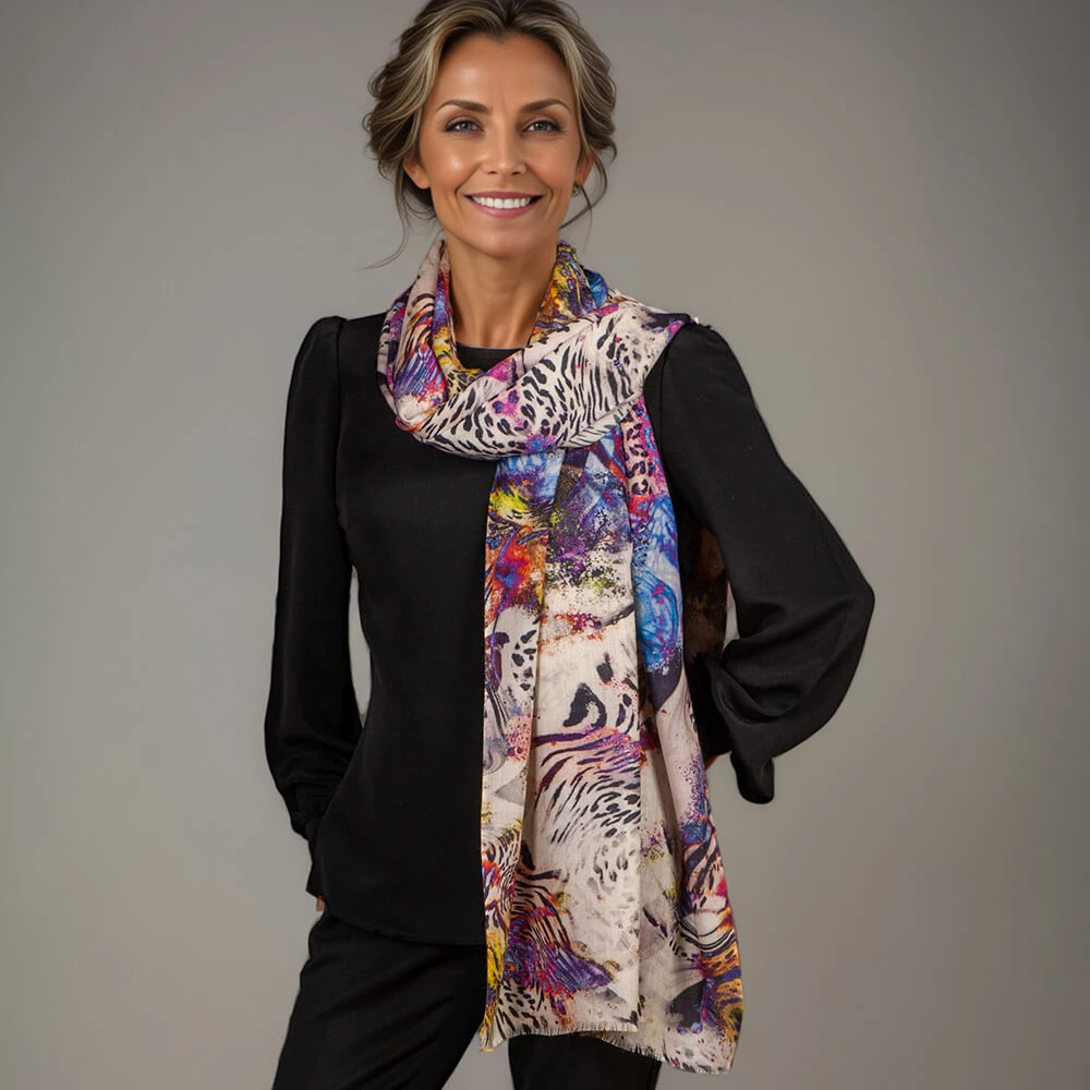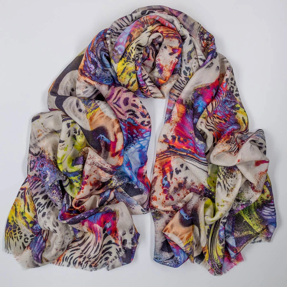 Untamed beauty meets modern artistry in this striking quartet of cashmere and silk printed wraps. Each piece fuses subtle whispers of primal patterns with abstract flourishes of vivid, vibrant hues. Designed by us this collection of four unique wraps re-imagines the ever popular animal prints in a journey through dazzling colour, texture and wild elegance.