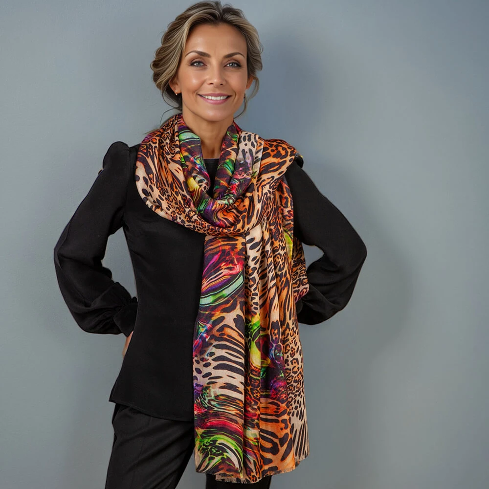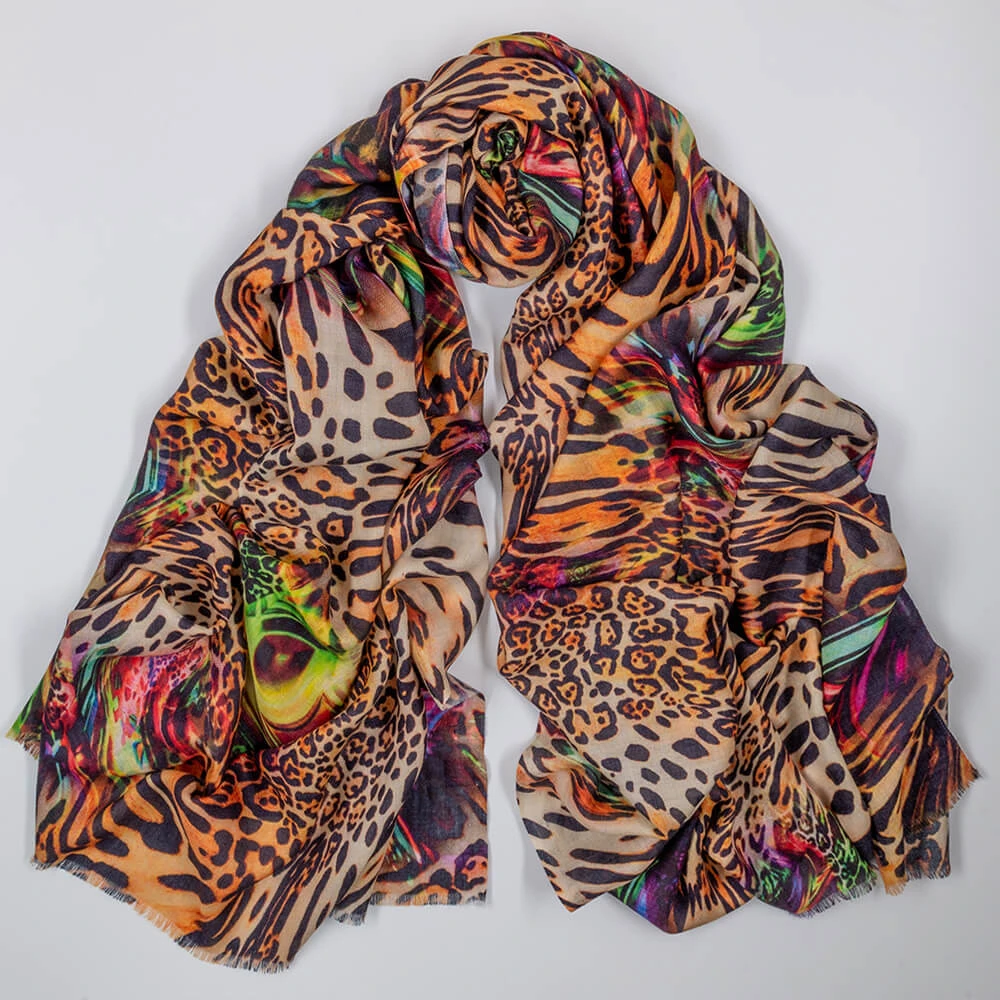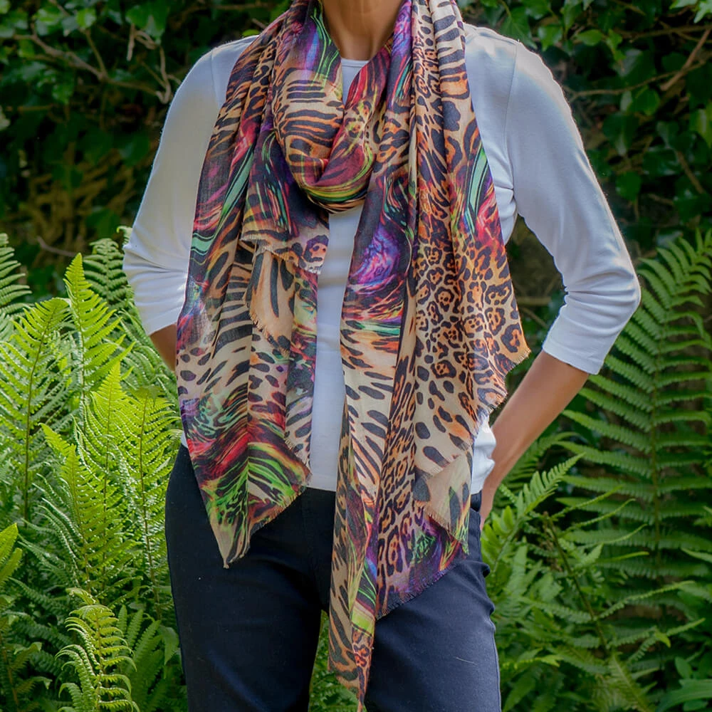 Untamed beauty meets modern artistry in this striking quartet of cashmere and silk printed wraps. Each piece fuses subtle whispers of primal patterns with abstract flourishes of vivid, vibrant hues. Designed by us this collection of four unique wraps re-imagines the ever popular animal prints in a journey through dazzling colour, texture and wild elegance.
