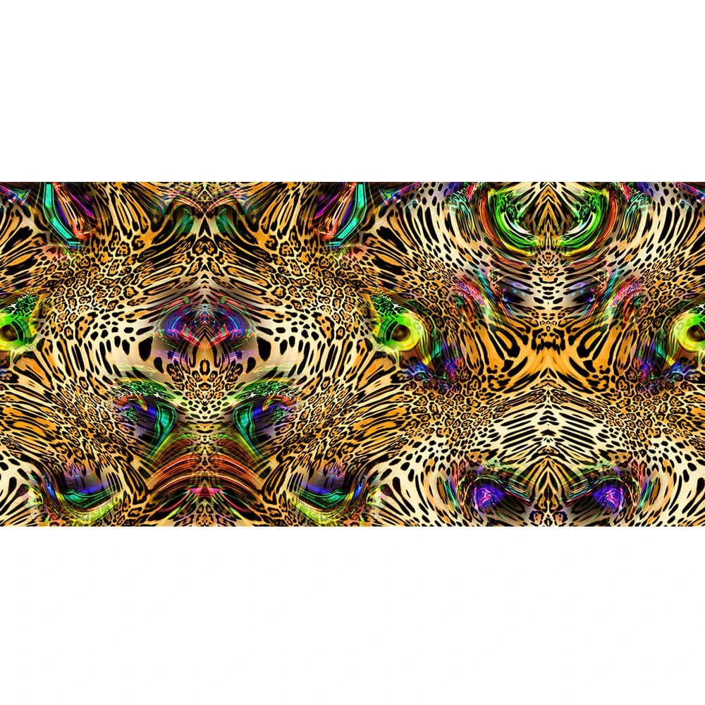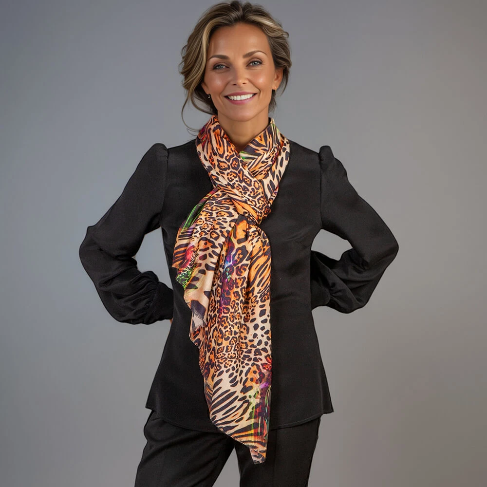 Jungle Mirage is a striking fusion of vivid green and earthy tones of brown, blending the vibrant leopard print with bold abstract swirls that evoke the raw energy of the jungle. Crafted from a soft blend of cashmere and silk, it is lightweight yet warm and it drapes elegantly. Generously sized it works equally well as a scarf and shawl.