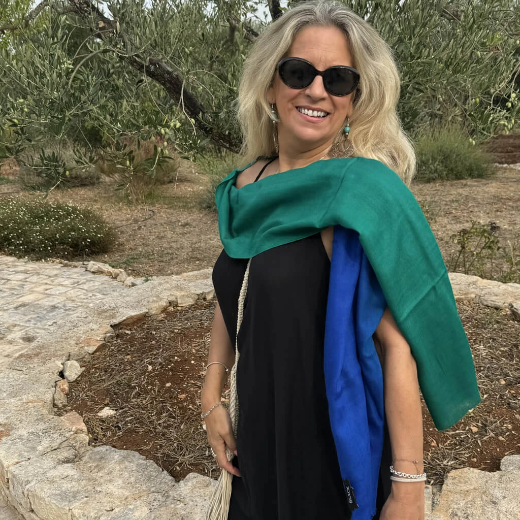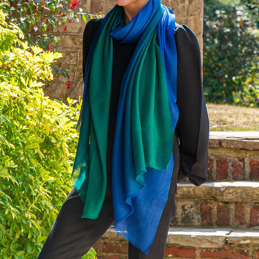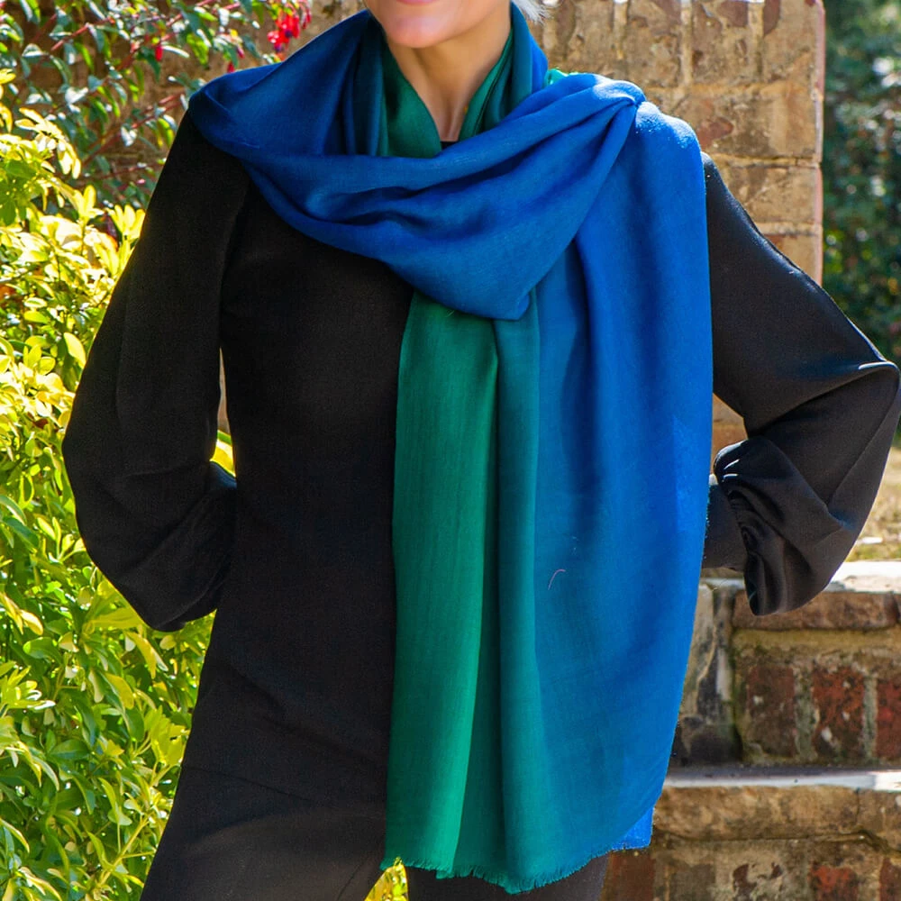 Rich vibrant jewel tones of this emerald to sapphire cashmere and silk wrap dispel the myth that blue and green should never be seen! The effortless shading from a emerald green through to sapphire blue gives this striking wrap impact. . The perfect weight as a year round accessory it is expertly crafted from a clever blend of cashmere and silk. Soft to the touch, light and warm and it drapes elegantly. Generously sized at 200 x 70cm