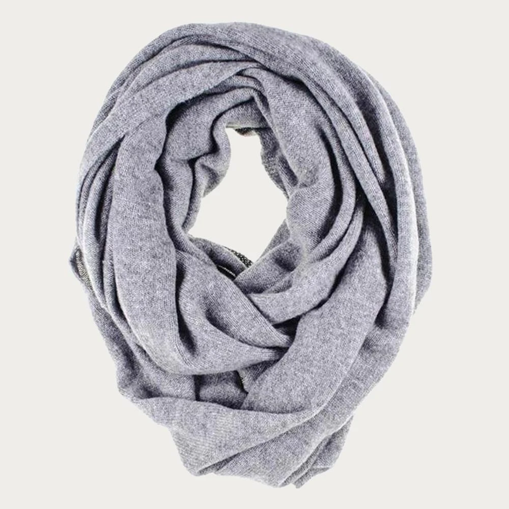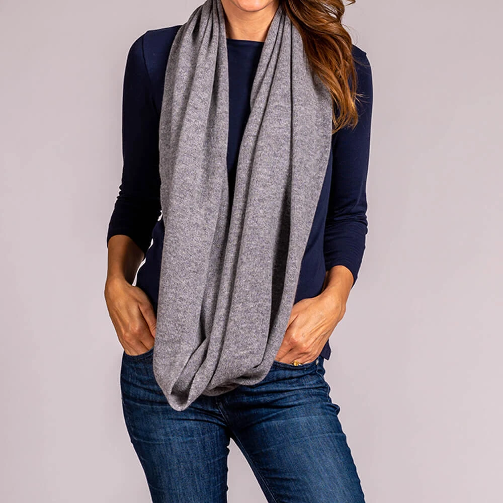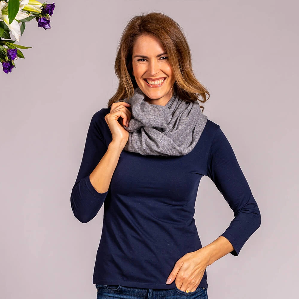 This versatile large cashmere snood in a warm grey tone can be worn singly as a long slouchy snood or doubled as an extra warm neck warmer and collar. Knitted in Italy from fine cashmere yarn it is luxuriously soft and warm: and can be pulled over the head to keep winter chills at bay.