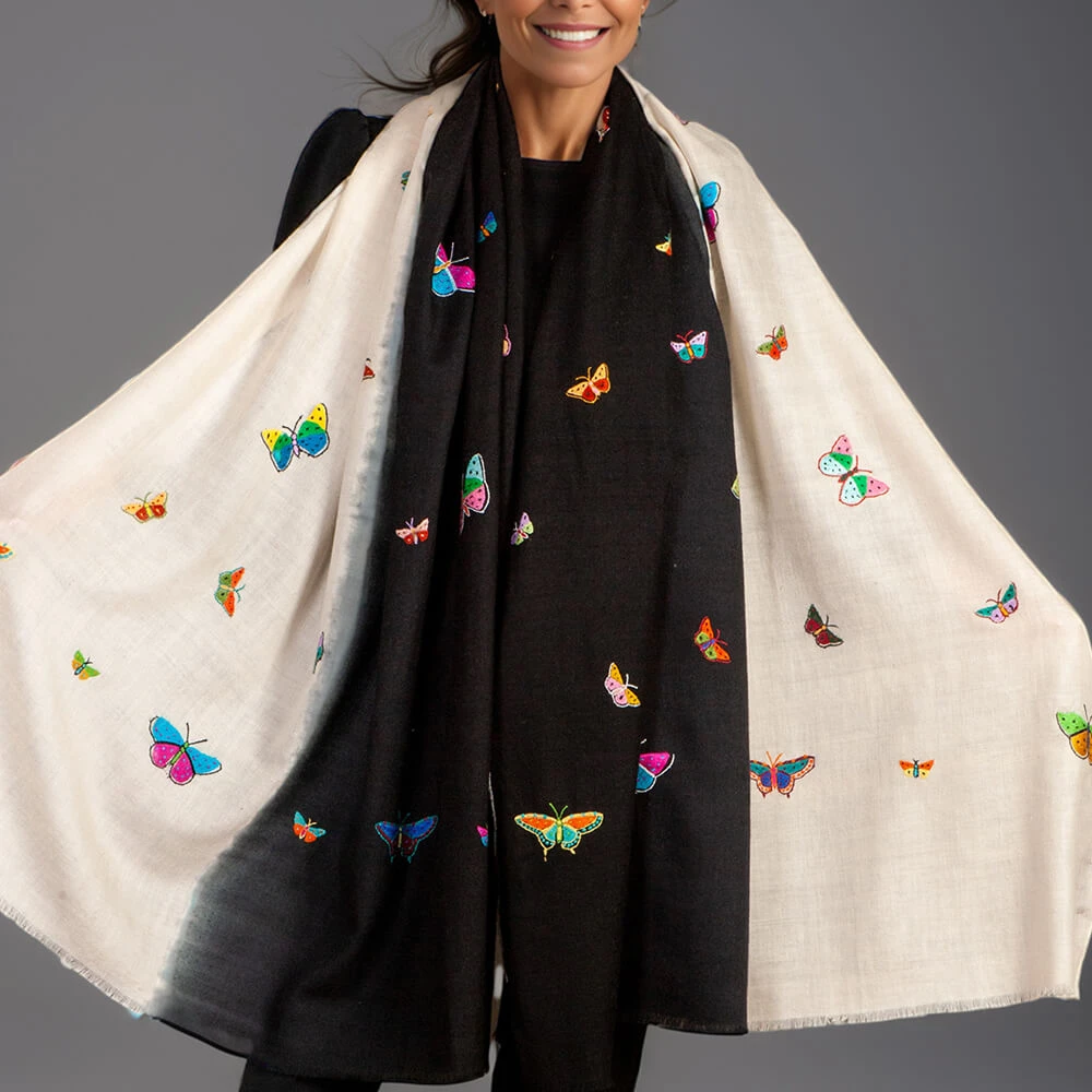 Blending traditional artistry with contemporary design this exquisite shawl, half in black and half in white, features delicately embroidered butterfly motifs scattered through the shawl in an array of colours and sizes. This is a truly beautiful piece. Luxuriously soft and warm, it carries the signatures of the artisans who made it embroidered in the corner