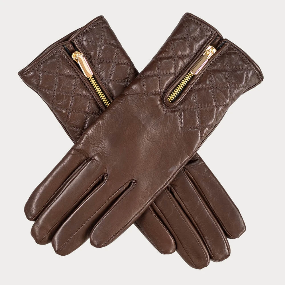 Meticulously crafted in Italy from buttery soft nappa leather, these rich dark brown leather gloves feature a neat quilting design and zip detail. The zip can be worn open or closed for a snugger fit. The quilting adds texture and refinement making these gloves a stand out accessory. Lined with 100% cashmere for warmth and comfort they embody the perfect blend of timeless style and exquisite craftsmanship.