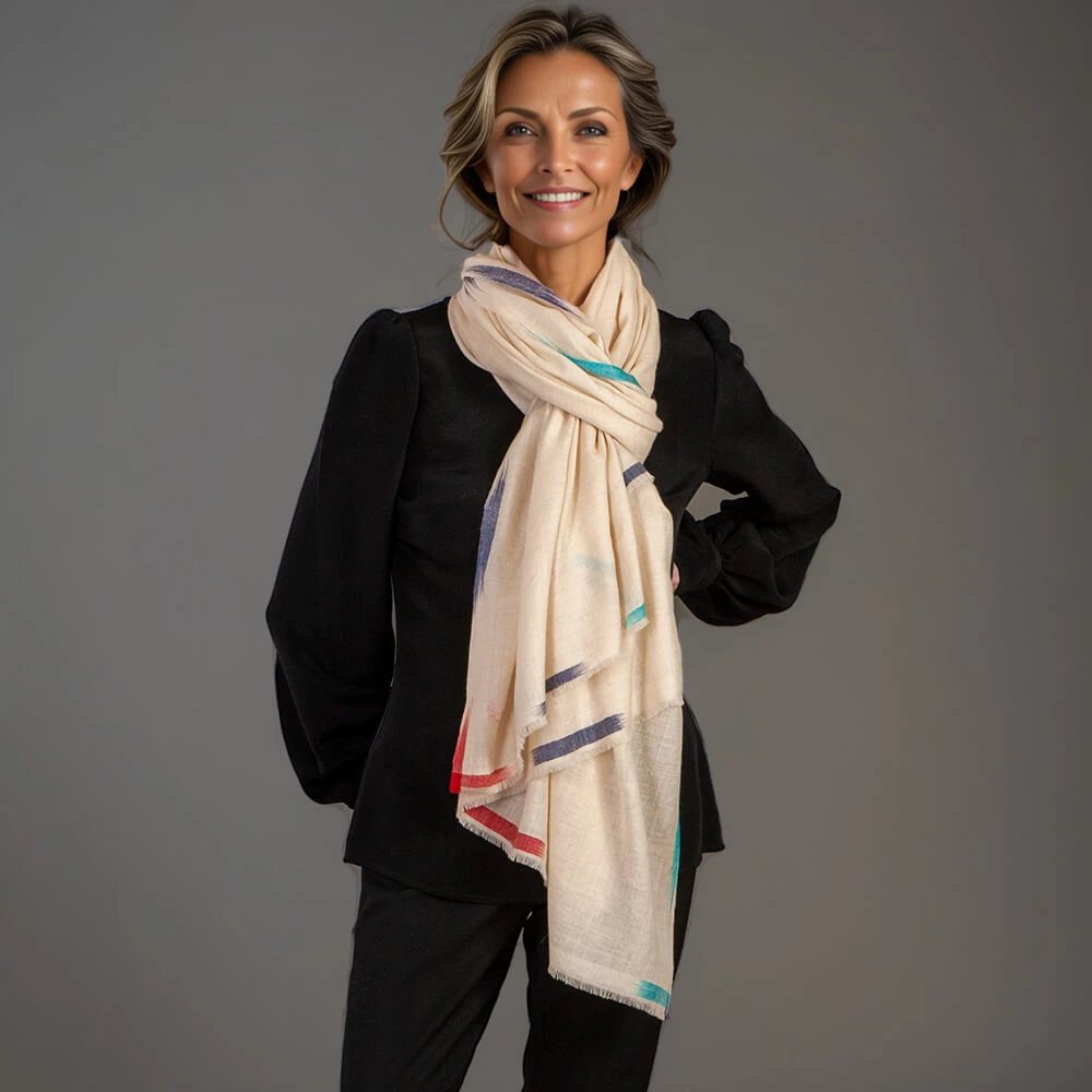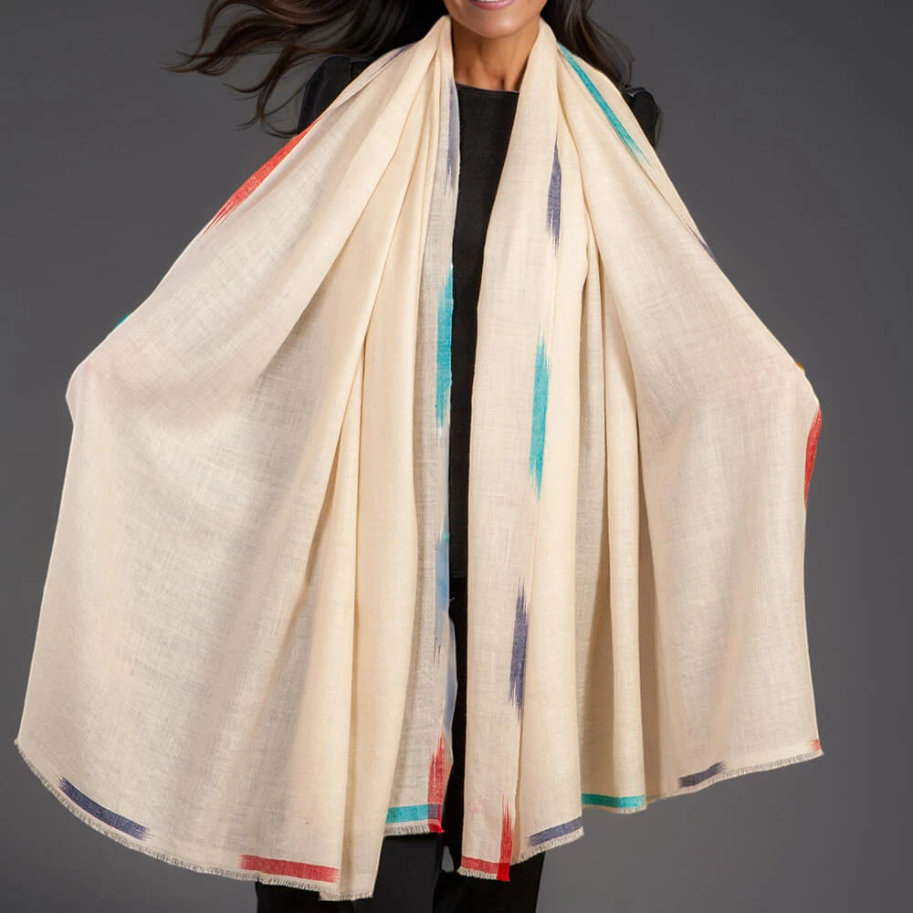 The unique Ikat treatment on the borders of this large cream pashmina cashmere shawl give it an unusual and chic effect. Discreet tones of navy, teal terracotta and purple contrast effortlessly with the solid navy shawl. Hand spun and hand woven it is painstakingly crafted from the finest pure pashmina yarn; it is exceedingly soft to the touch, light and warm and wonderfully comfortable to wear.