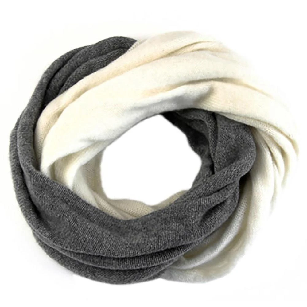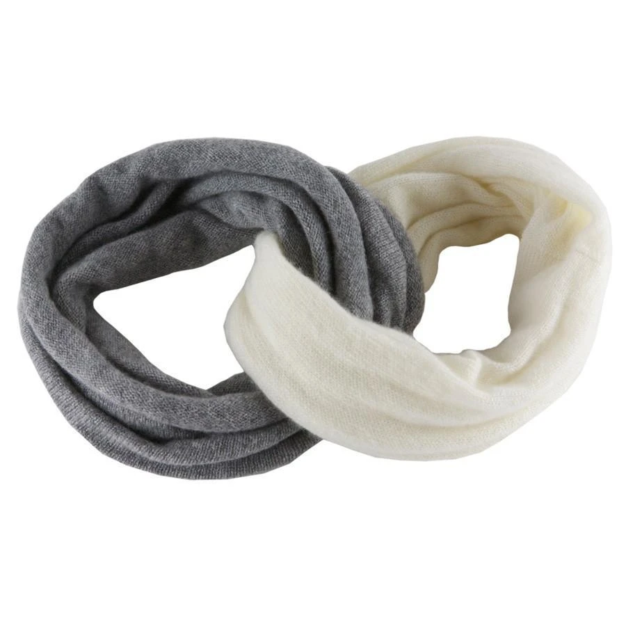 This luxurious two-in-one Italian knitted cashmere neck warmer in soft cream and light grey doubles as a snood-and-hood. It is cleverly constructed from two circular snoods linked together to form a double colour neck-warmer and it can also be worn as a neck warmer and hood by pulling either one of the individual snoods up over the head to form a cosy hood for chilly winter days.