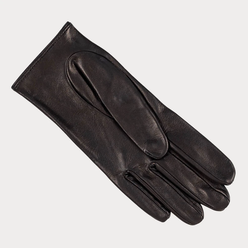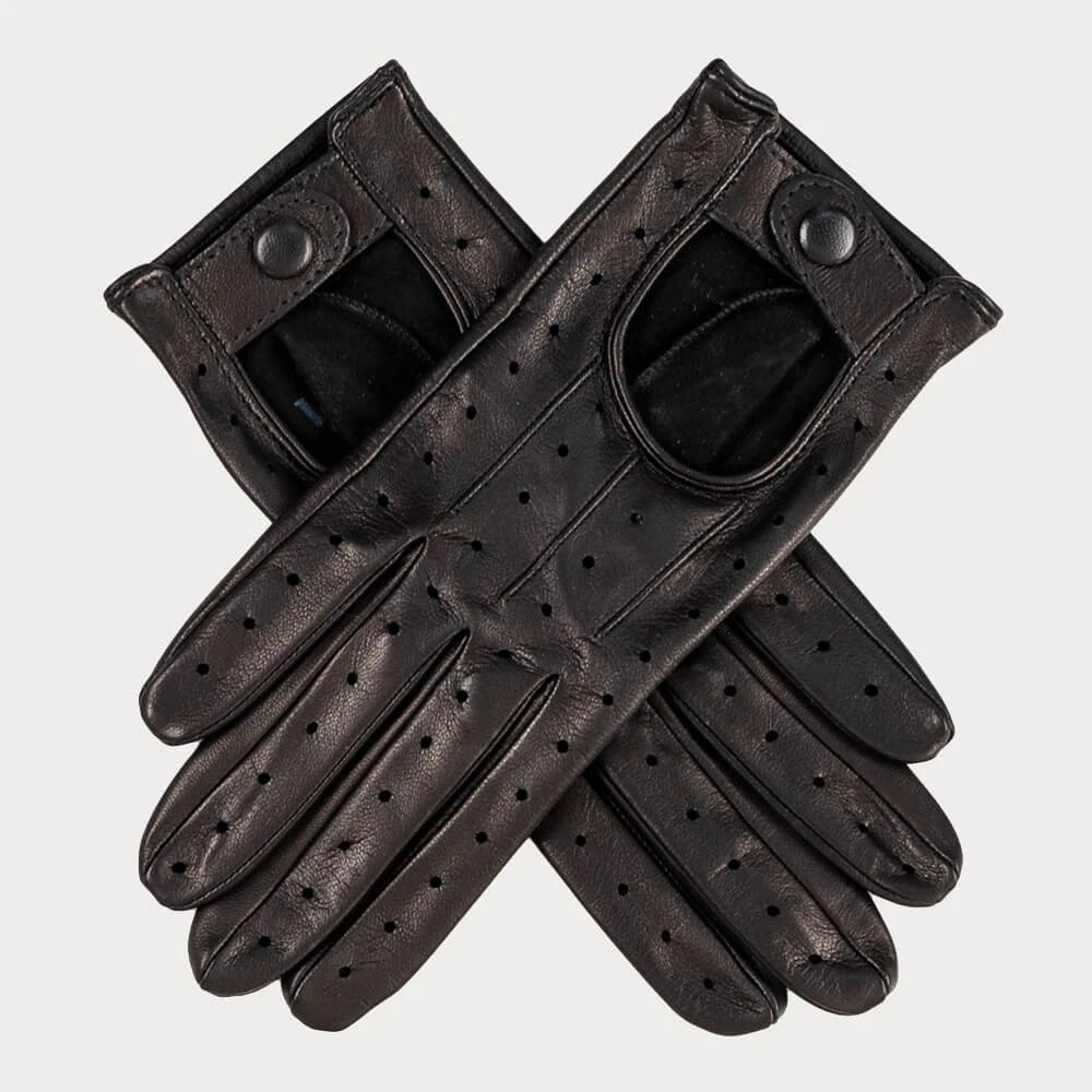 Combining style and function these black Italian leather driving gloves are a chic accessory whether you are behind the wheel or not. Crafted from superbly soft nappa leather which moulds elegantly to your hands, they have a snug and comfortable fit. The classically designed perforations ensure breathability and the open back provides ease of movement. Perfect for year round wear these drivers give you grip and dexterity. Finished with a leather covered press stud and strap.