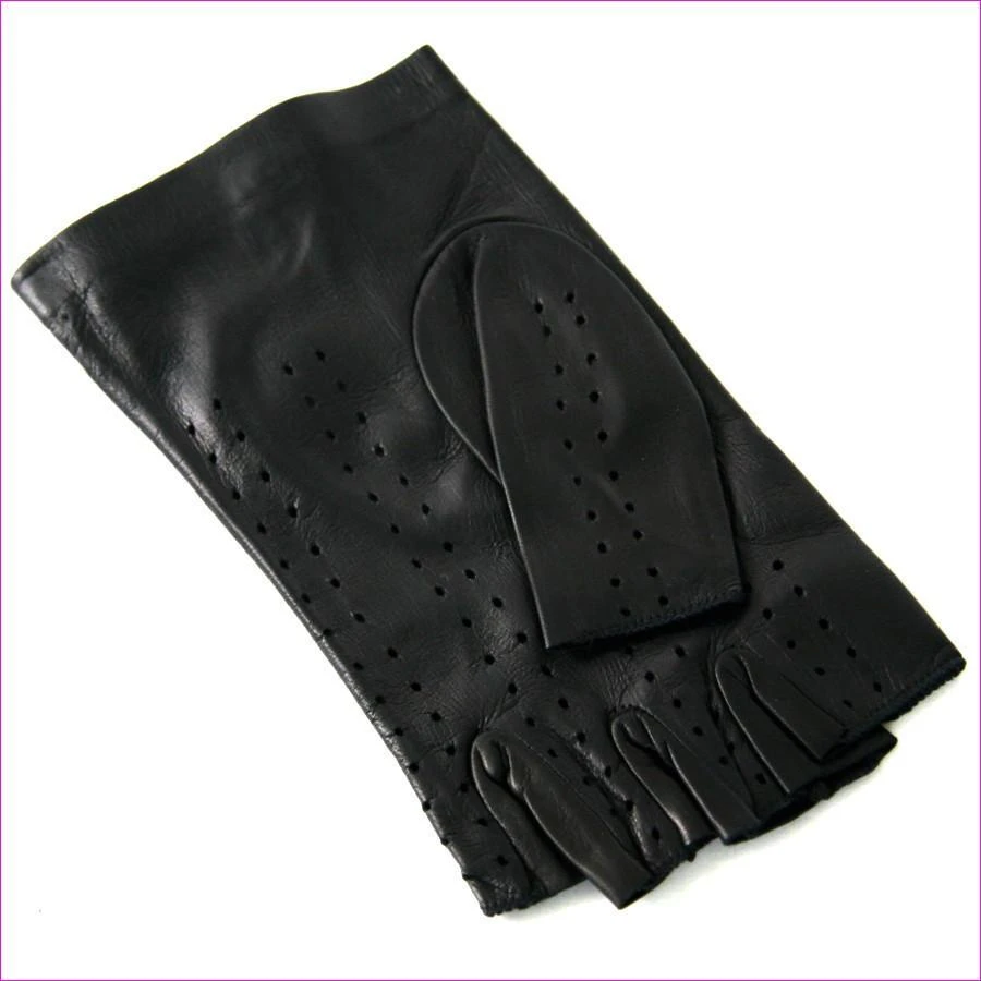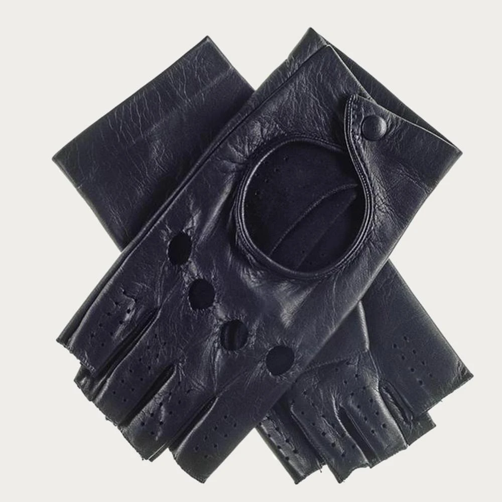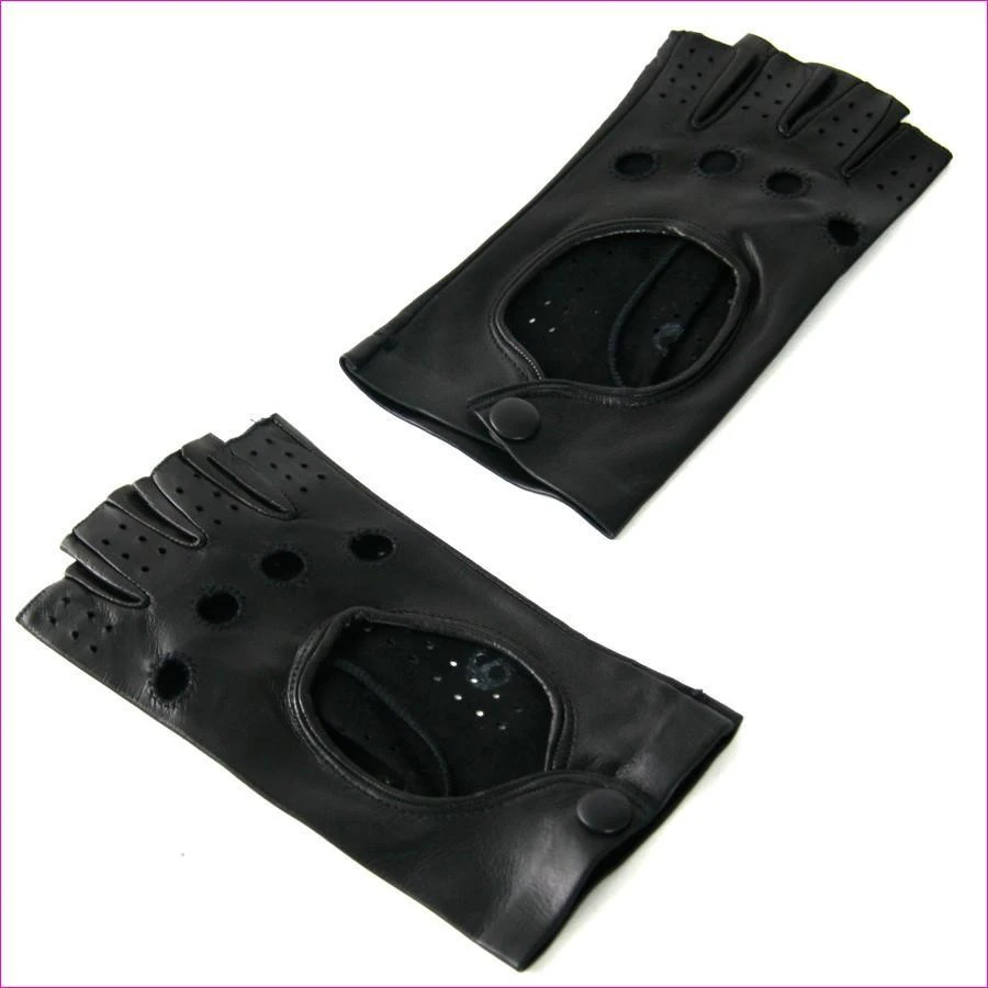 Chic and on trend these ladies’ black Italian nappa leather fingerless gloves are crafted from buttery soft Italian leather and are as popular as ever. The style resembles a classic driving glove with a wide vent and handstitched mini-vents above – but with the fingers cut off and stitched over to prevent fraying or wear. They are unlined and finished with a leather covered button.
