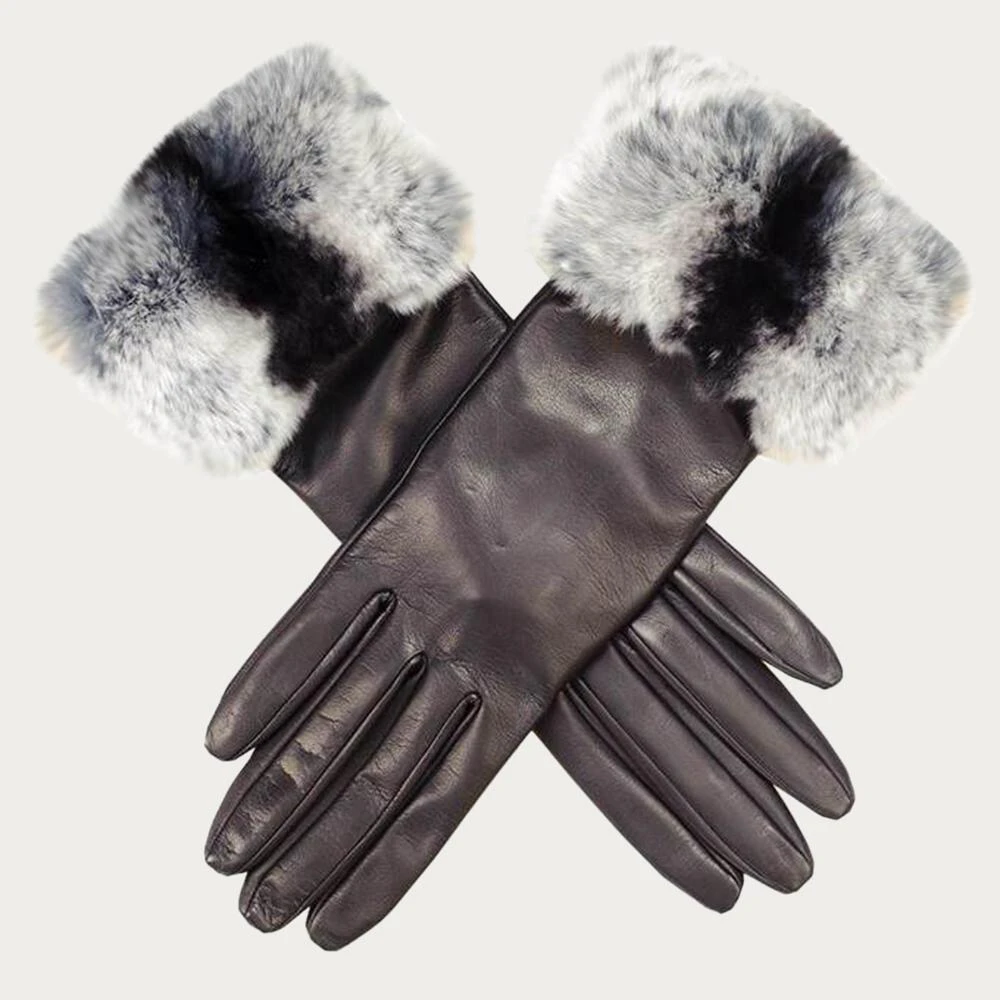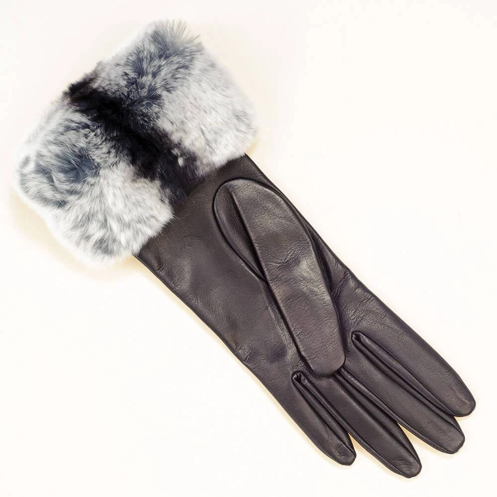 Glamourous and indulgent these elegant black leather gloves with chinchilla toned rabbit fur cuffs are real show stoppers. Crafted in Italy from the softest nappa leather they are lined with black silk for a sleek flattering fit. The finishing touch is a beautiful and lusciously thick and deep rabbit fur cuff in black, grey and white chinchilla tones. The glove measures 28 cm from the tip of the middle finger and the fur cuff is 7 cm deep.