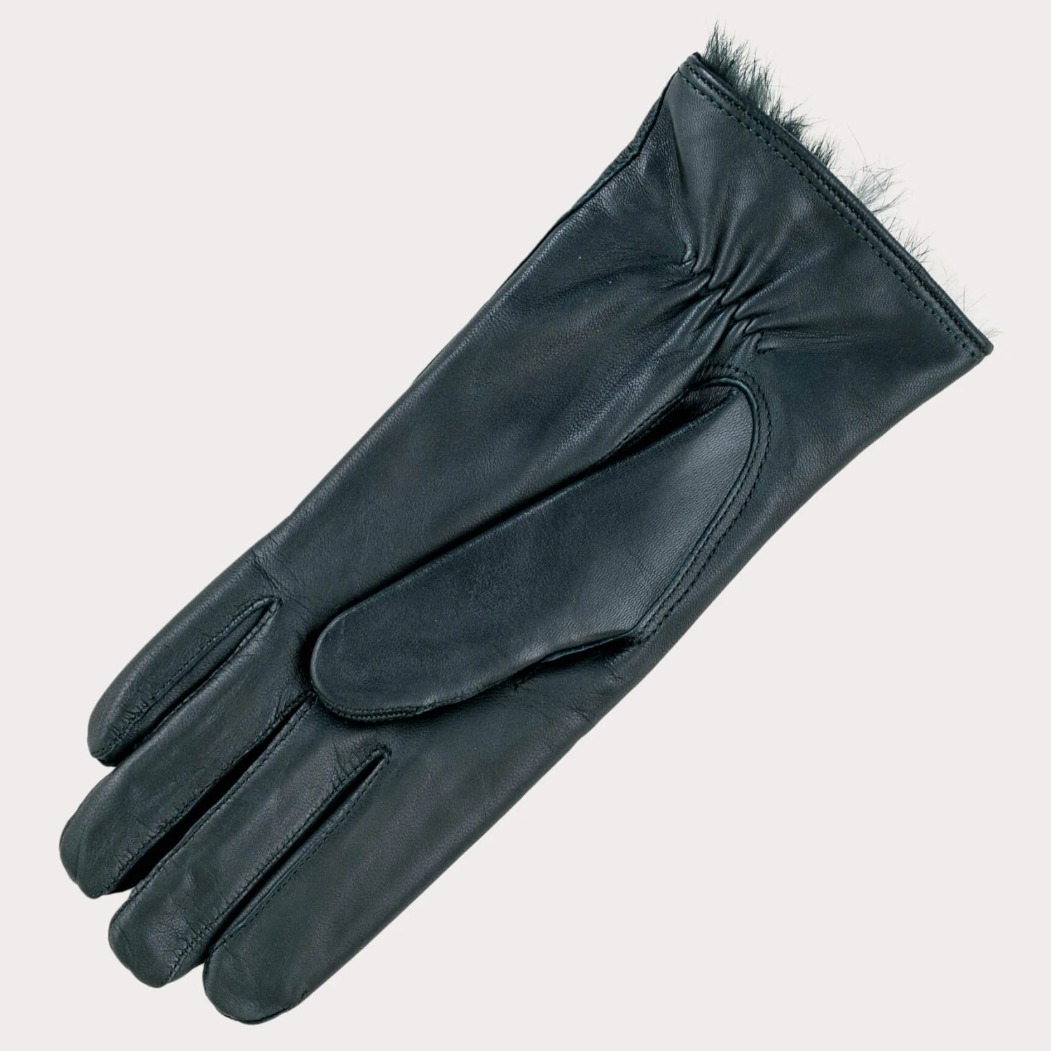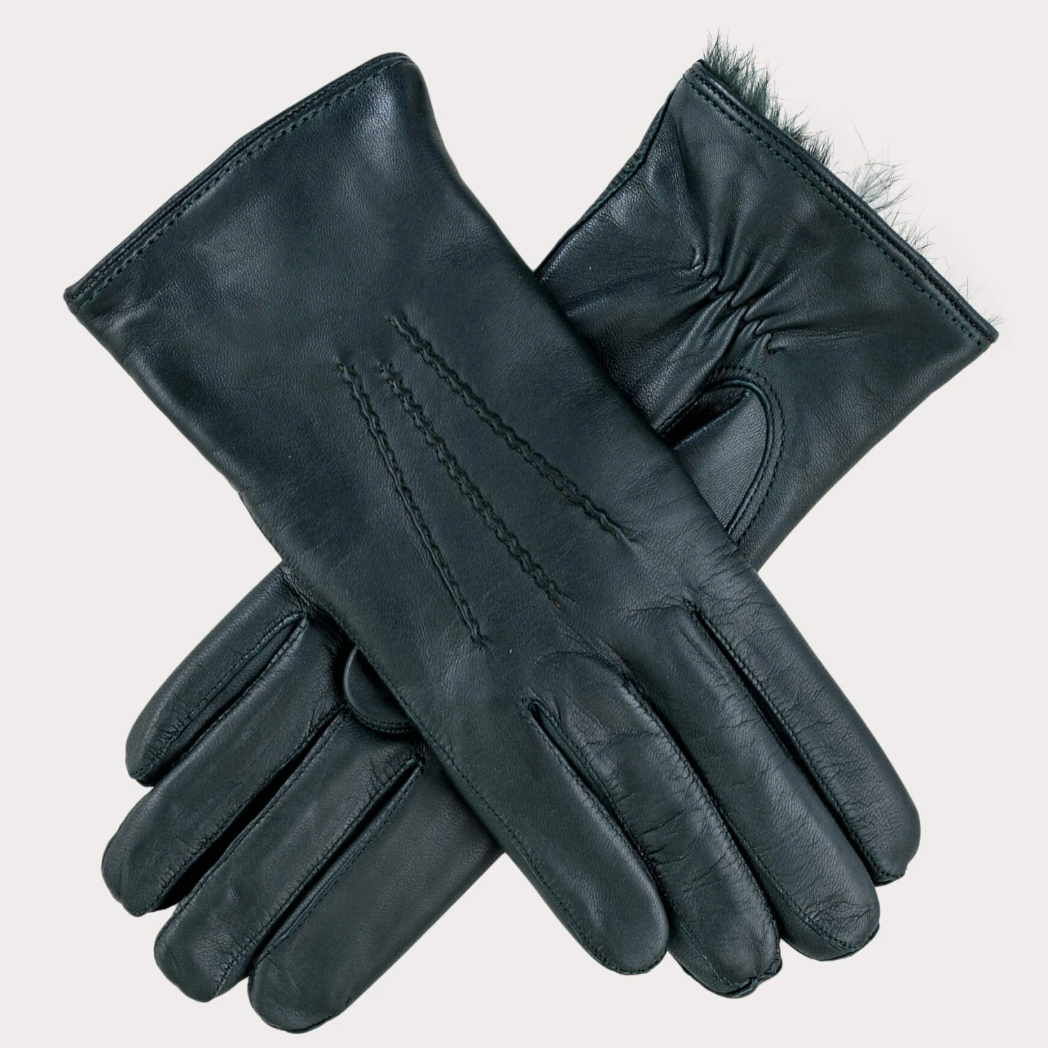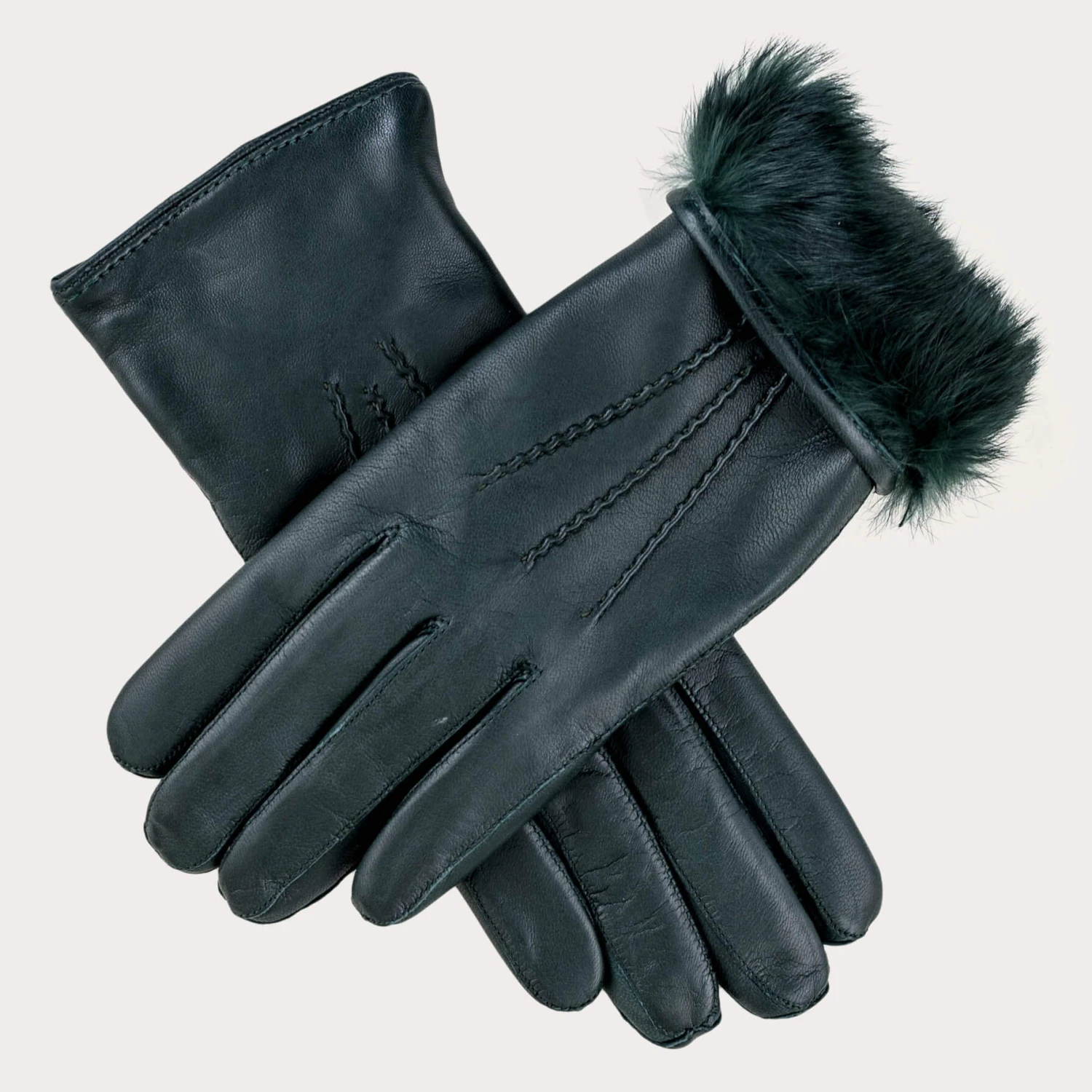 Divinely warm for town and country these buttery soft women’s green rabbit fur lined leather gloves will keep you cosy all winter long. Impeccably made in Italy from sublimely supple dark green nappa leather and fully lined with matching dark green rabbit fur they can be worn with the cuffs rolled over to reveal the fur lining. They are finished with three rows of stitching, or points for a professional finish.