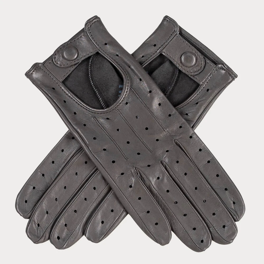 Combining style and function these pewter grey Italian leather driving gloves are a chic accessory whether you are behind the wheel or not. Crafted from superbly soft nappa leather which moulds elegantly to your hands, they have a snug and comfortable fit. The classically designed perforations ensure breathability and the open back provides ease of movement. Perfect for year round wear these drivers give you grip and dexterity. Finished with a leather covered press stud and strap.