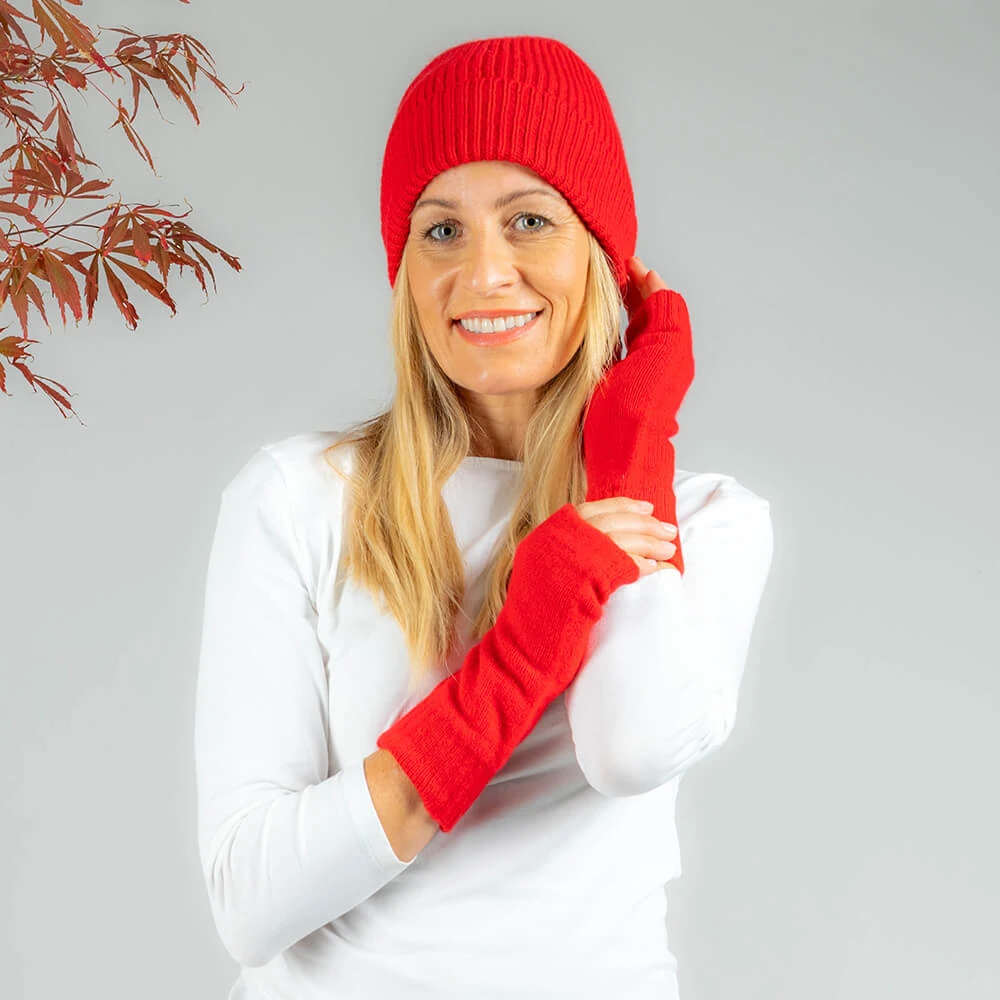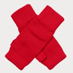 Knitted from the softest Scottish cashmere, these ruby red cashmere wrist warmers will ensure your hands stay warm all winter long. They have a double ribbed layer at the fingers and cuff for extra comfort and this prevents stretching or curling. Pretty and practical they are perfect for those who have cold hands as they leave the fingers free for tasks you couldn’t do with gloves.