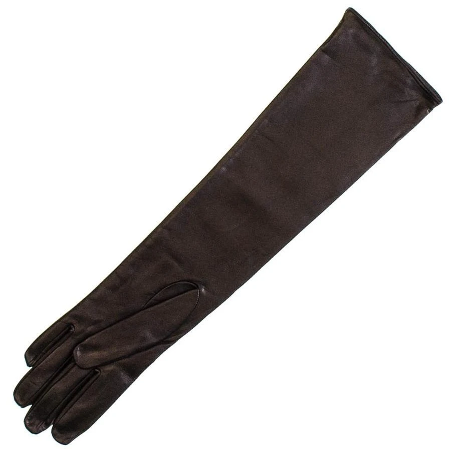 Simple elegance characterises these glamorous elbow length long leather opera gloves which are lined with black silk. Crafted from the softest black nappa leather they are designed to come just above the elbow and can be worn extended or pushed down for a ruched look. From the tip of the middle finger to the top they measure 46 cm.
