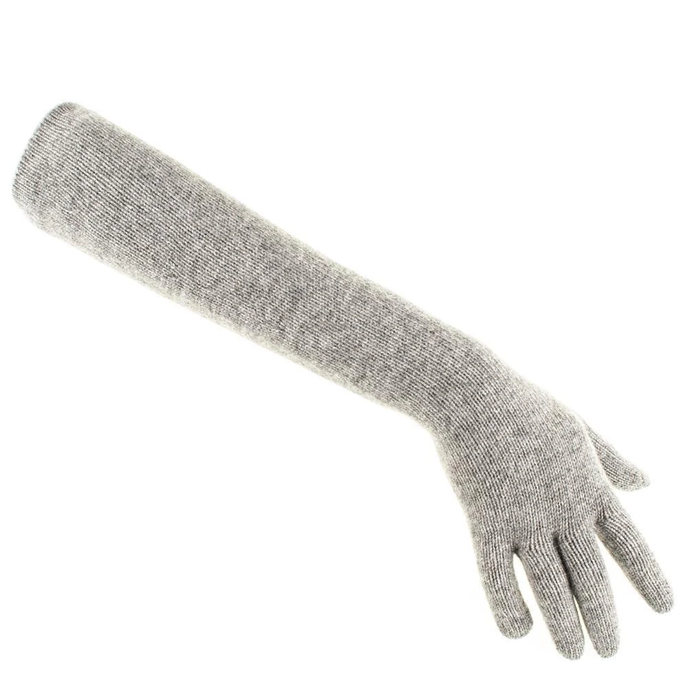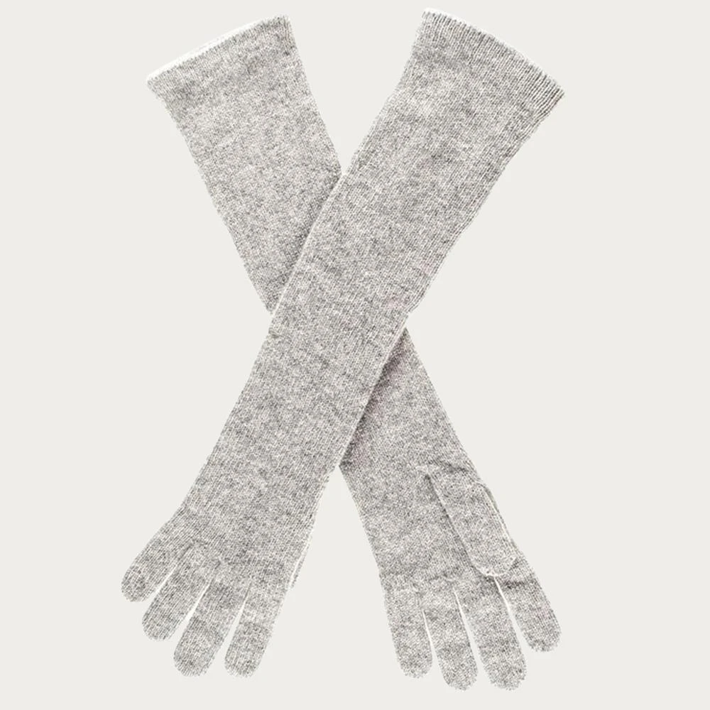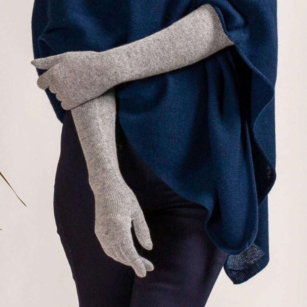 Keep cosy in the cold with these elbow length grey cashmere gloves in light to mid grey. Made in Italy from the best quality cashmere yarn they are soft and warm and can be worn full length or ruched for a relaxed and easy style. These gloves are hemmed at the top to prevent curling.
