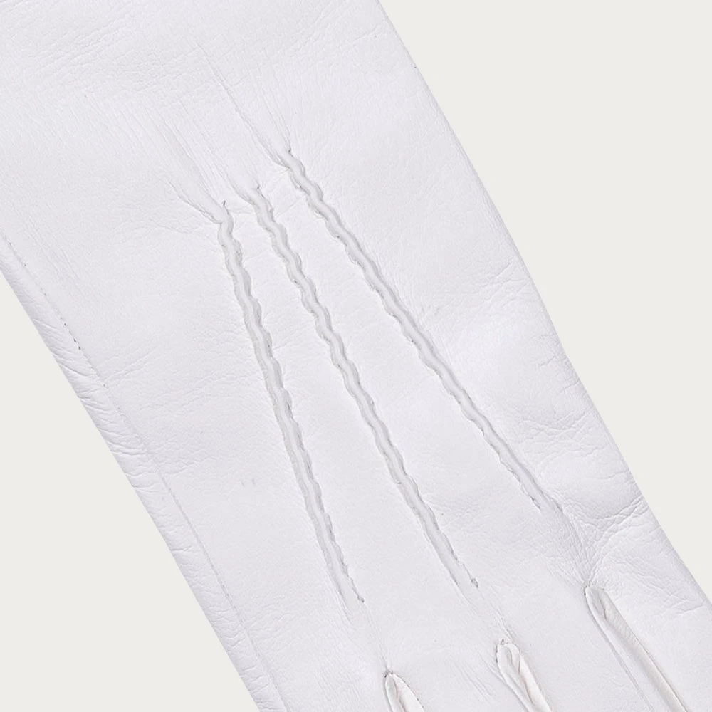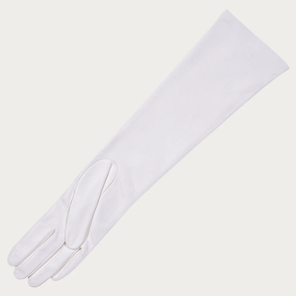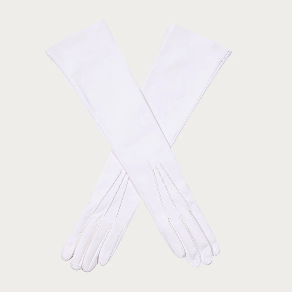 Sophisticated elegance characterises these glamorous elbow length long white leather gloves. Crafted from the softest white nappa leather they are designed to come just above the elbow. Wear them full length or rushed down. Easy to wear they are full lined with soft black silk and the three points give them a professional finish. Perfect for weddings and balls.