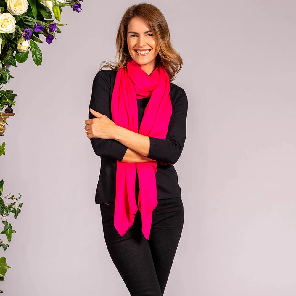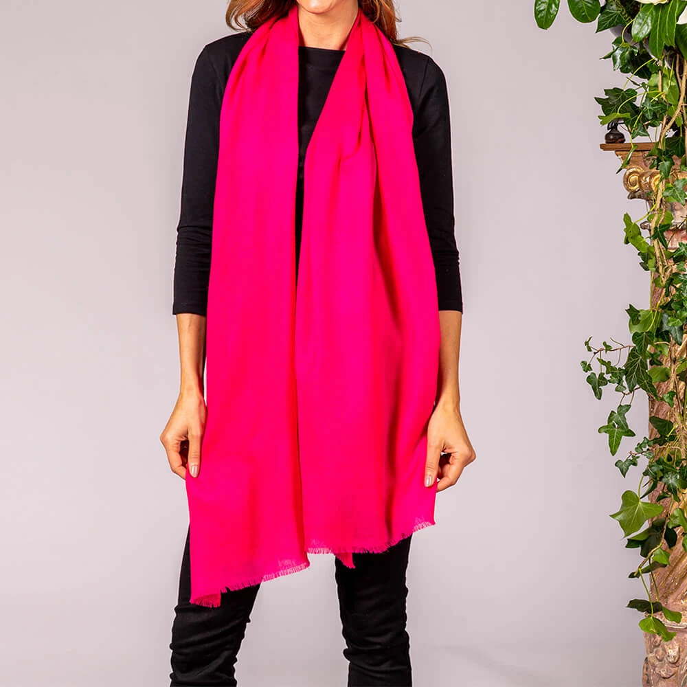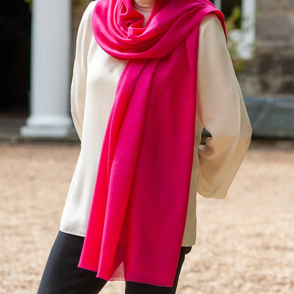 In an eye-popping colour this magenta pink cashmere and silk wrap follows the season’s love of brights and is from our new collection of vivid plains. It is expertly crafted from a clever blend of cashmere and silk. Soft to the touch, light and warm it is a perfect year round wrap and it drapes elegantly. Generously sized at 200 x 70cm