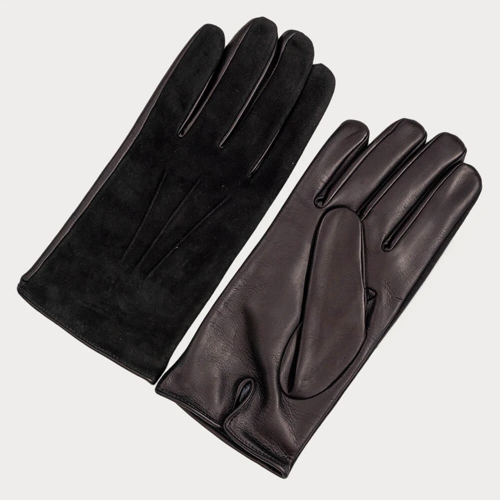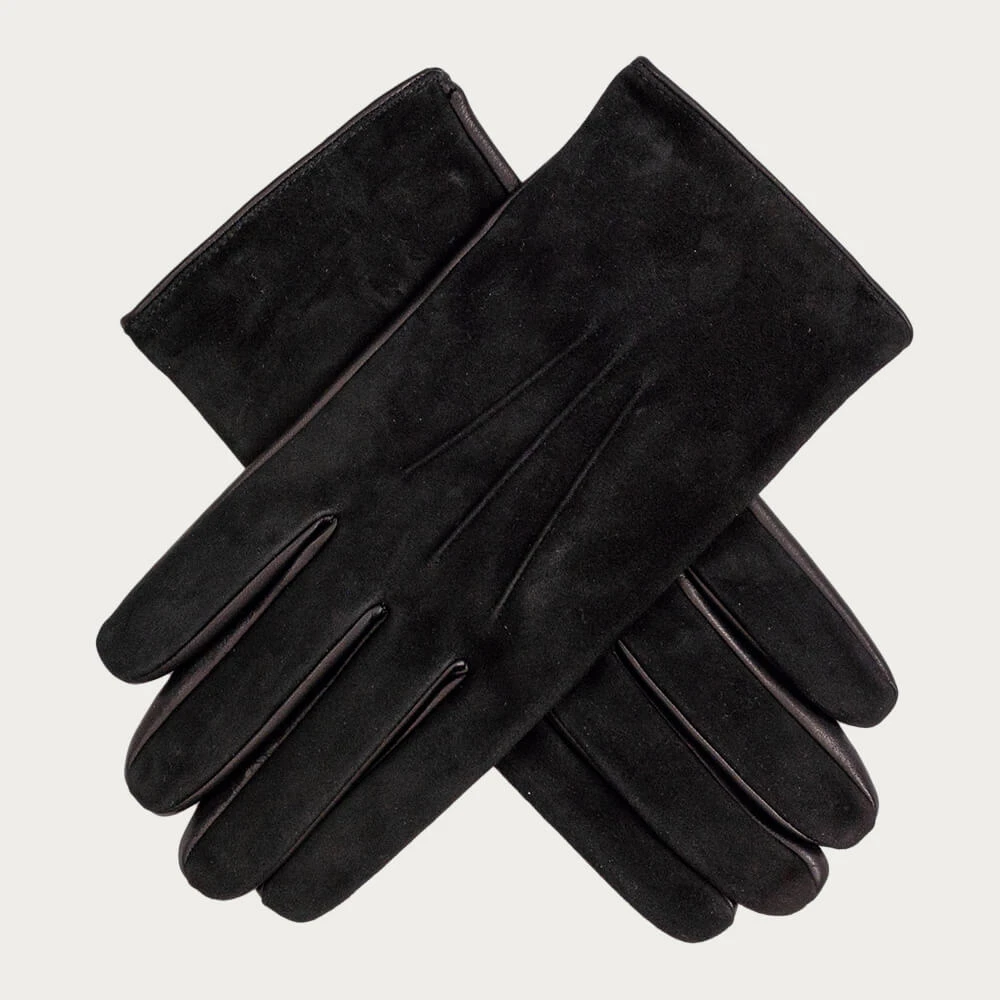 Sleek and sophisticated these black suede and leather Italian nappa gloves are silk lined for an elegant look as well as for warmth and comfort. Crafted from first rate Italian leather the top is in suede and the palm in black leather making these special gloves both practical and chic. They make the perfect evening and special occasion gloves