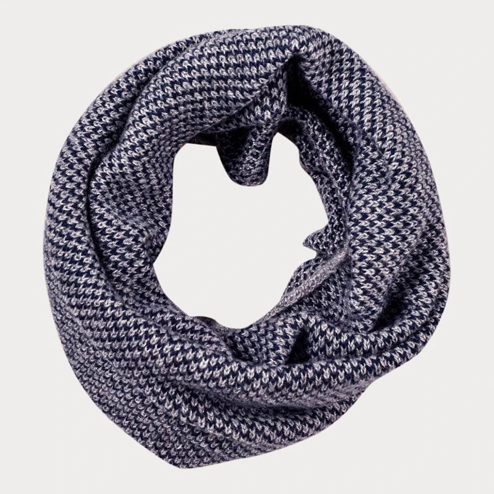 The simplest of snoods this two tone navy and grey pure cashmere neck warmer slips on to provide warmth and softness for the neck. Made in Italy from high quality cashmere yarn it is knitted in a subtle chevron design, fits snugly and feels wonderfully soft. Tucks away neatly for travelling.