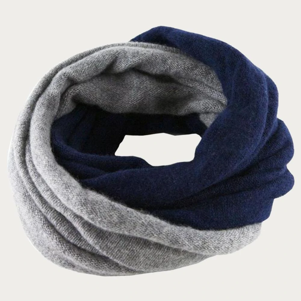 Made in Italy from the finest cashmere this wonderfully soft two-in-one knitted cashmere snood in rich navy and mid-grey can be worn as a double snood or as a snood cum hood It is made by linking two circular snoods together giving a casual two-tone effect as a classic neck-warmer. It can also be worn with one of the snoods pulled over the head as a cosy hood for cold winter days.