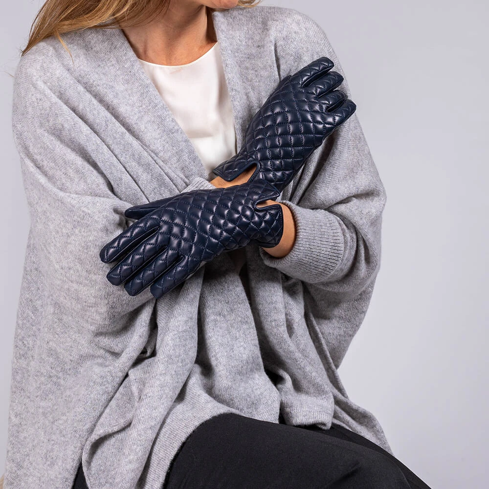 If you favour the more classic style of leather glove but still want something a little different then these navy blue quilted leather gloves with cashmere lining might be for you. Made from soft Italian nappa leather the back of the hand is fully quilted and finished with a neat centre vent while the palm is unquilted. For winter warmth and comfort the gloves are fully lined with 100% cashmere and are a good length, finishing 4 cm above the wrist.