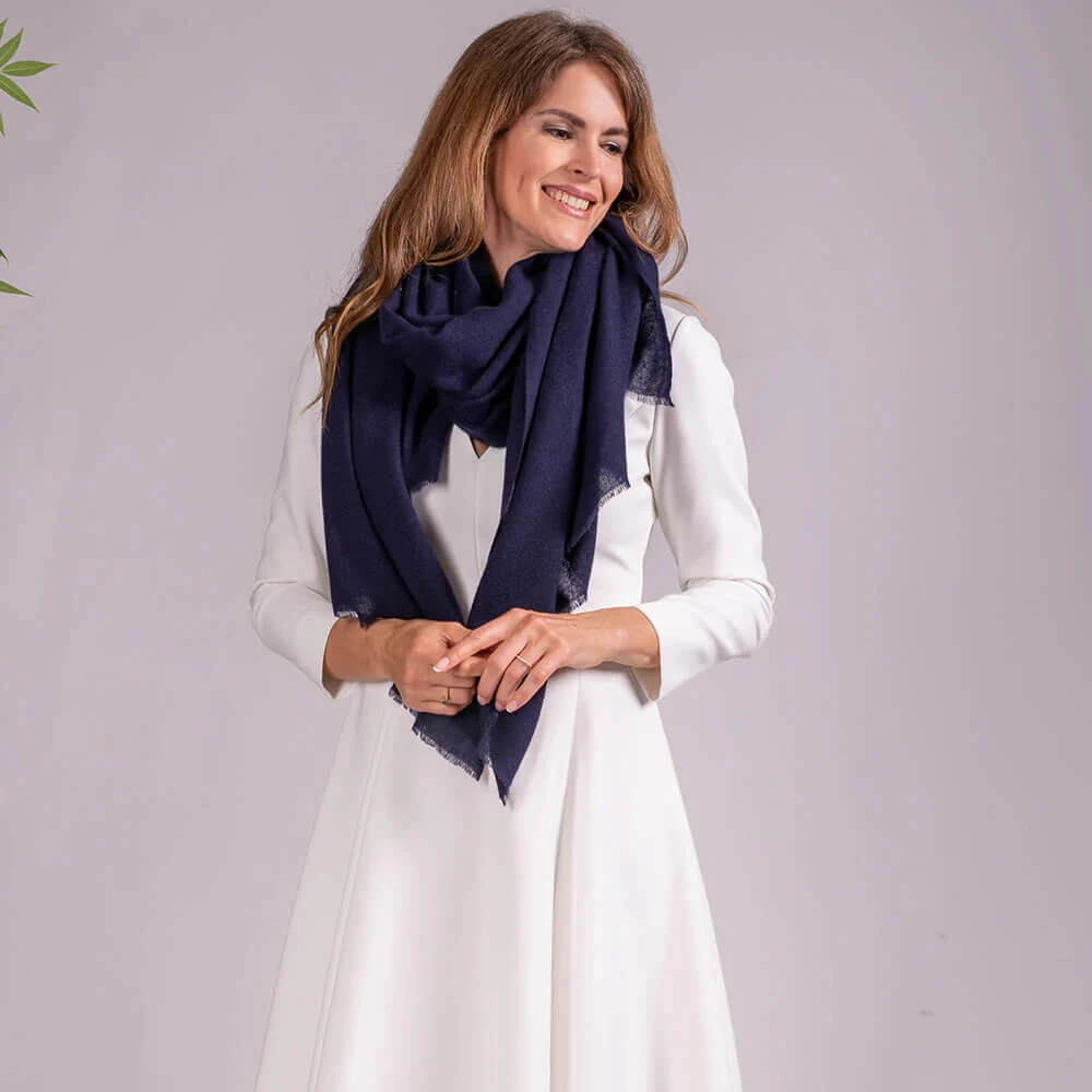 The Navy Gossamer Cashmere Shawl is a masterpiece of delicate craftsmanship, offering a whisper-soft feel and an ethereal drape that enhances any outfit. Its deep navy hue provides a versatile elegance, making it an essential accessory for both daytime sophistication and evening grace.