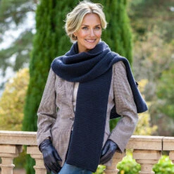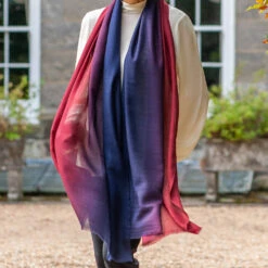 Two richly bold and intense colours harmonise dramatically in this shaded navy to burgundy cashmere and silk wrap, perfect as a year round accessory. Expertly crafted from a clever blend of cashmere and silk it is soft to the touch, light and warm and a perfect year round wrap which drapes elegantly. Generously sized at 200 x 70cm