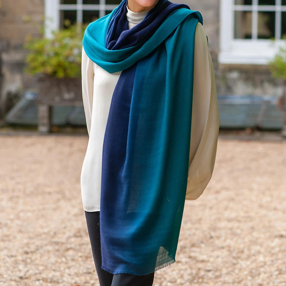 Intensely vibrant peacock tones of deep blue and rich teal green merge together in this navy to teal shaded cashmere and silk wrap dispelling the myth and green and blue should never be seen together. Crafted from a fine blend of cashmere yarn and silk it is soft to the touch, light and warm and a perfect year round wrap which drapes elegantly. Generously sized at 200 x 70cm