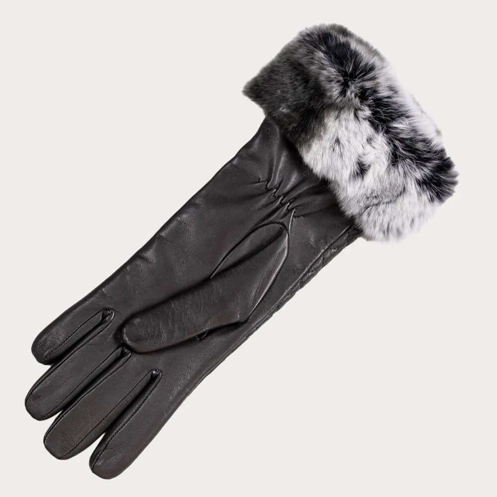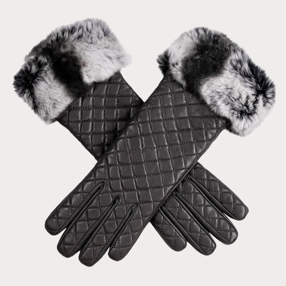 Glamourous and indulgent these elegant pewter grey quilted leather gloves with chinchilla toned rabbit fur cuffs are real show stoppers. Crafted in Italy from the softest nappa leather they are lined with cashmere for warmth and comfort. The finishing touch is a beautiful and lusciously thick and deep rabbit fur cuff in black, grey and white chinchilla tones. The glove measures 28 cm from the tip of the middle finger and the fur cuff is 7 cm deep.
