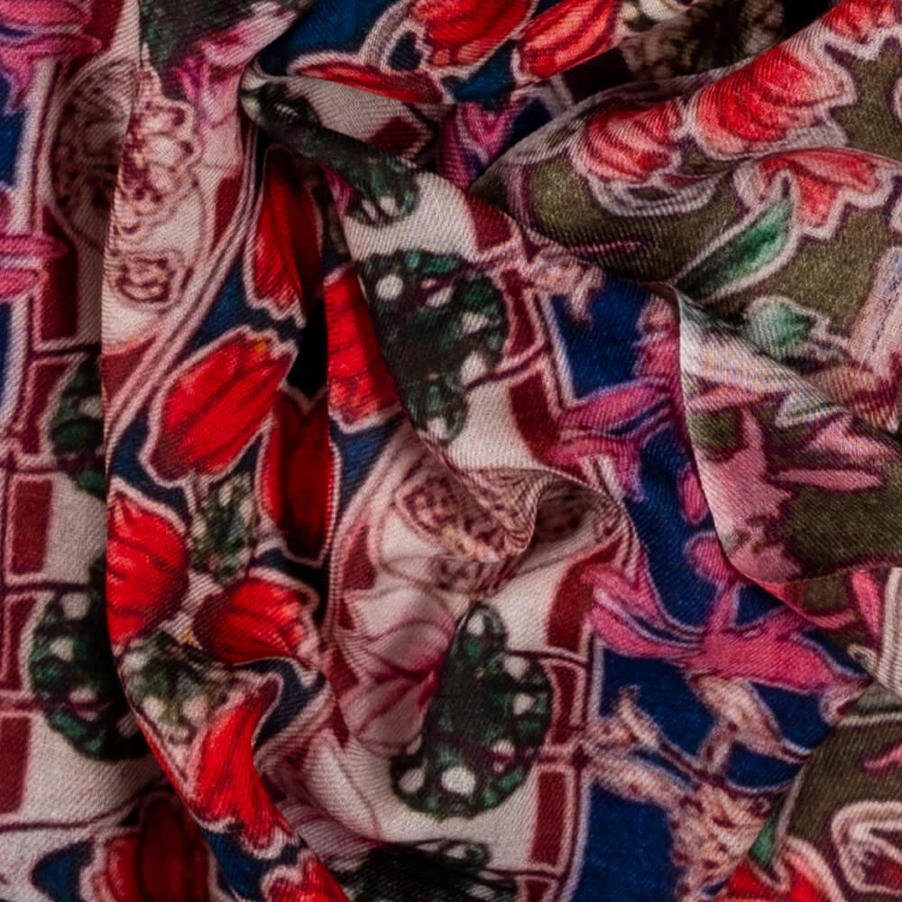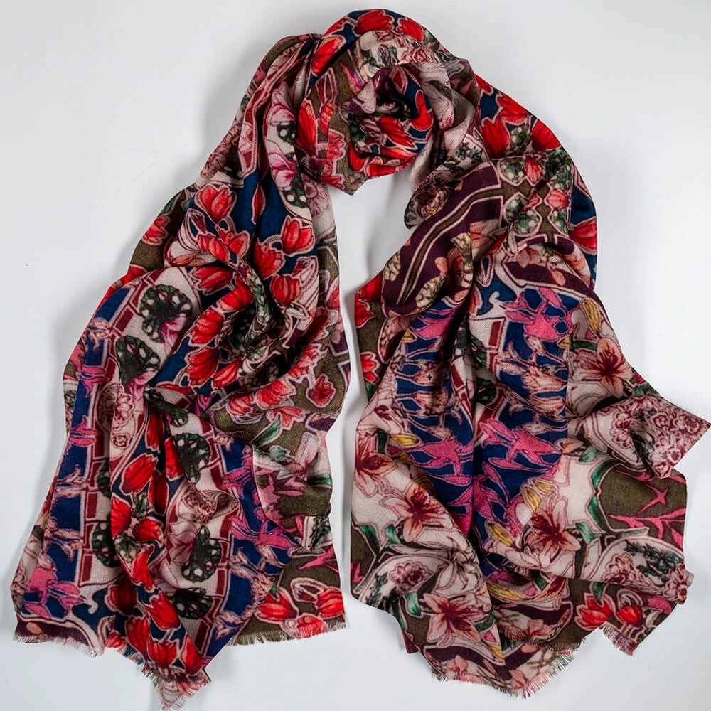 Flower Fete is a curated capsule of designs which provide a Liberty journey through a wealth of culturally and artistically diverse countries. These florals have been arranged in a highly stylized and complex layout, inspired by typical Art Nouveau tiles. Crafted from a clever blend of cashmere and silk the wrap is soft, warm, light and generously sized. It drapes effortlessly and is large enough to wear as a shawl.