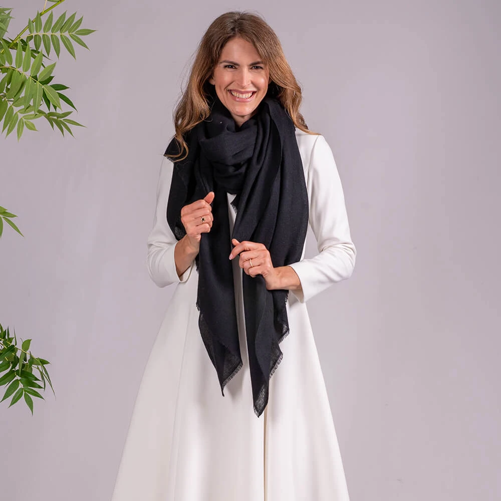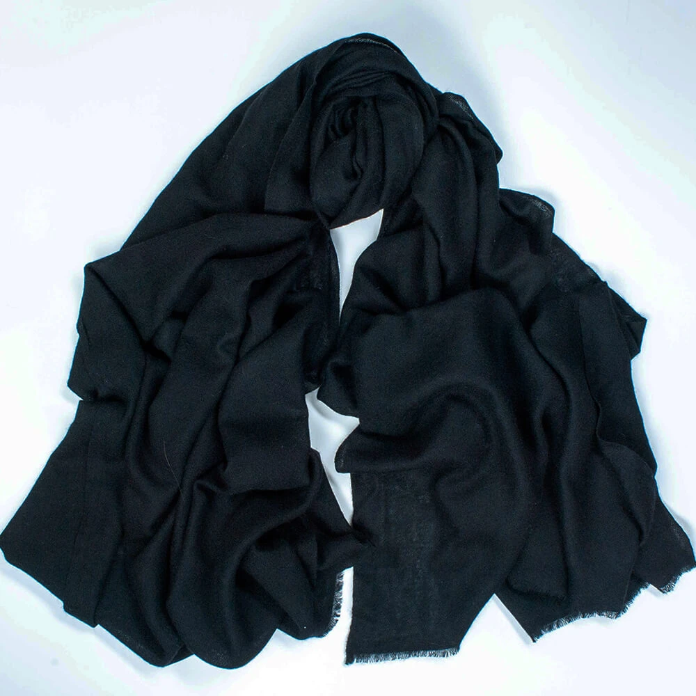 The perfect luxury wardrobe essential, this oversized sable black cashmere shawl (210cm x 105) will take you through every season, by day and by night. Finely spun from high quality cashmere in a gauzy weave this floaty shawl is semi sheer and drapes elegantly in gentle diaphanous folds. Ultra soft and light with a luxurious feel it is ideal for cool summer evenings as a wrap and for colder days tied as a generous scarf. Short eyelash fringing gives it a chic finish.