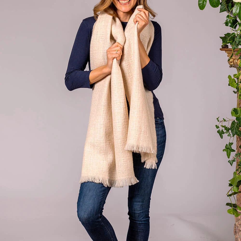 The softest cashmere yarn gives this super luxe Cornish cream pure cashmere shawl supreme warmth. Made in Kashmir It is expertly woven in a basket weave design which gives it a really plush texture. Meticulously crafted it is generously sized and finished with a 4cm fringe. This is a shawl you won’t want to be without. The basket weave collection is one of our founder’s favourites.