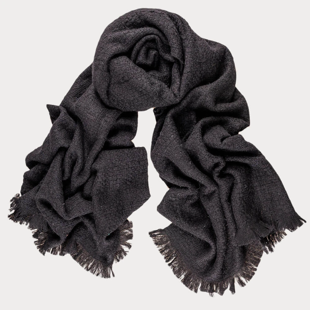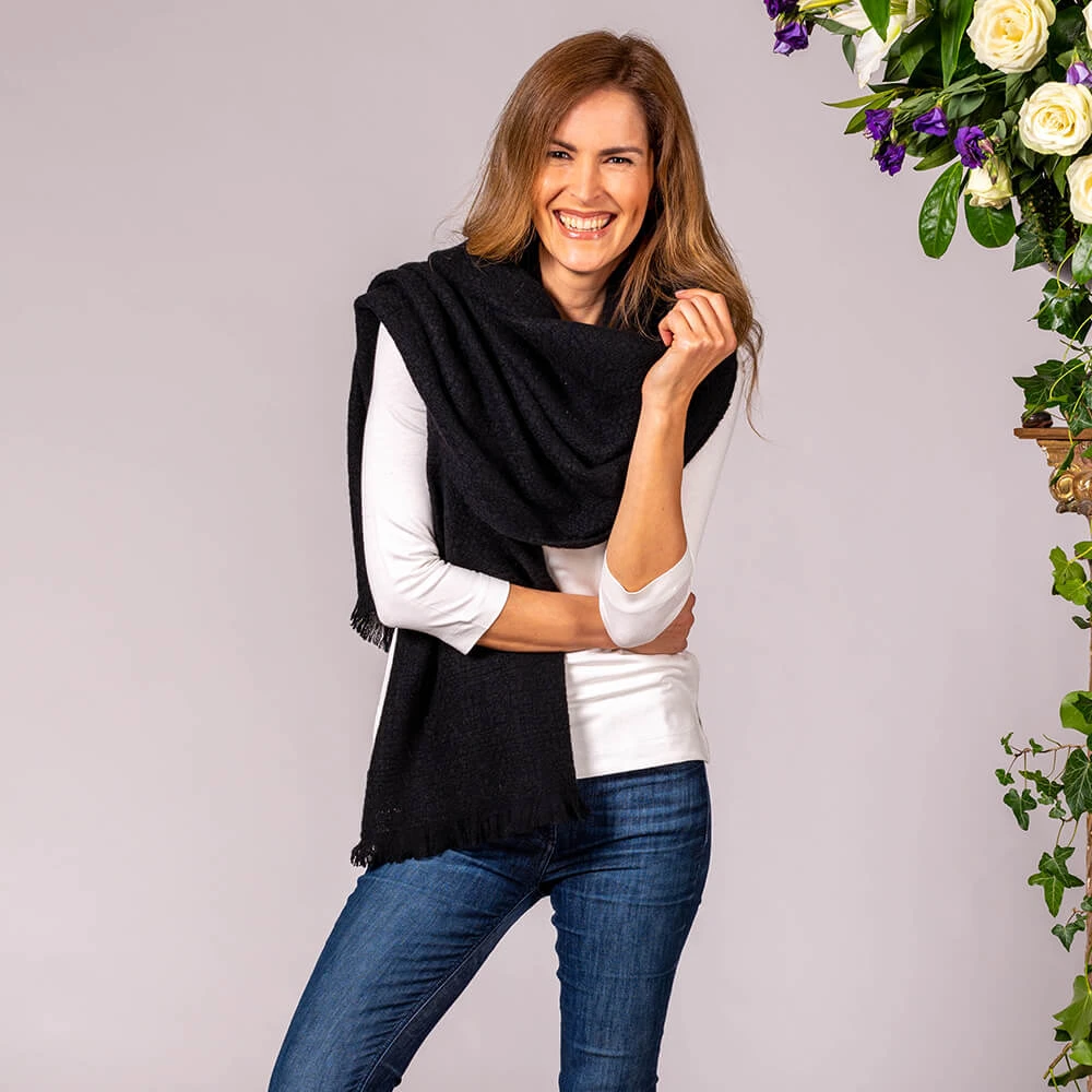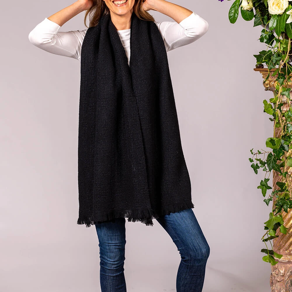 Our luxurious collection of basket weave cashmere shawls would be incomplete without black. This ebony black pure cashmere shawl is supremely soft to the touch and divinely warm and cosy. Made in Kashmir from premium cashmere yarn it is woven in a basket weave design which gives it a heavenly thick and unusual texture. Meticulously crafted it is generously sized and finished with a 4cm fringe. This is a shawl you won’t want to be without. The basket weave collection is one of our founder’s favourites.