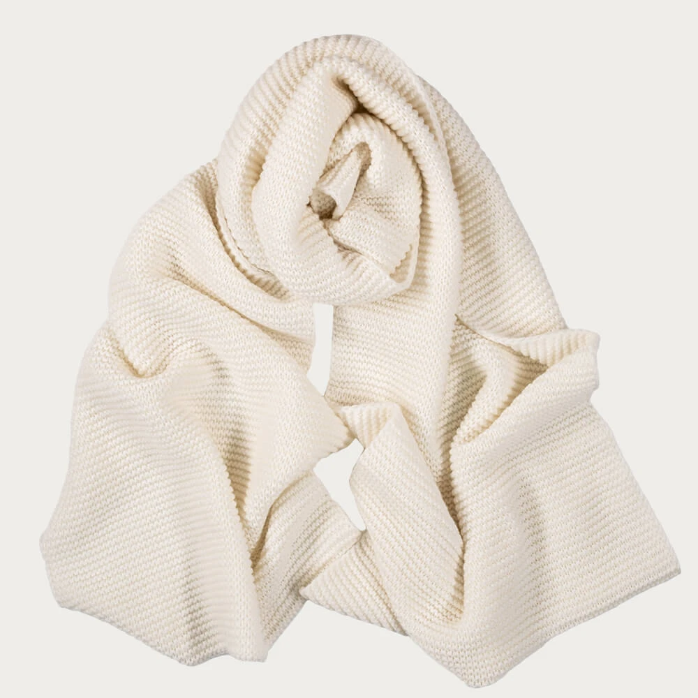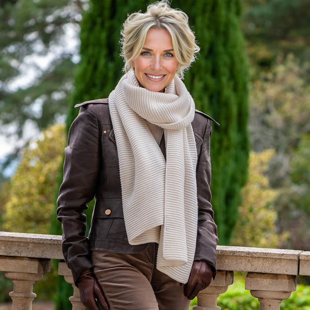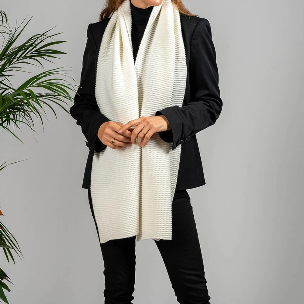 Long, lovely and luxurious this expertly crafted vanilla cream Italian pure cashmere scarf exudes understated elegance. Made from the finest cashmere the links knit four-ply texture gives it weight and substance. Offering wonderful warmth and softness the long length allows versatile styling whether draped, looped or double wrapped.