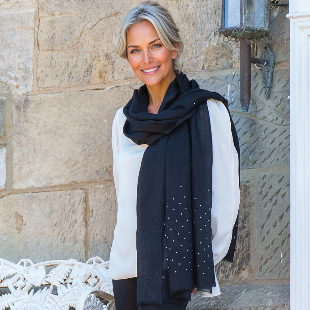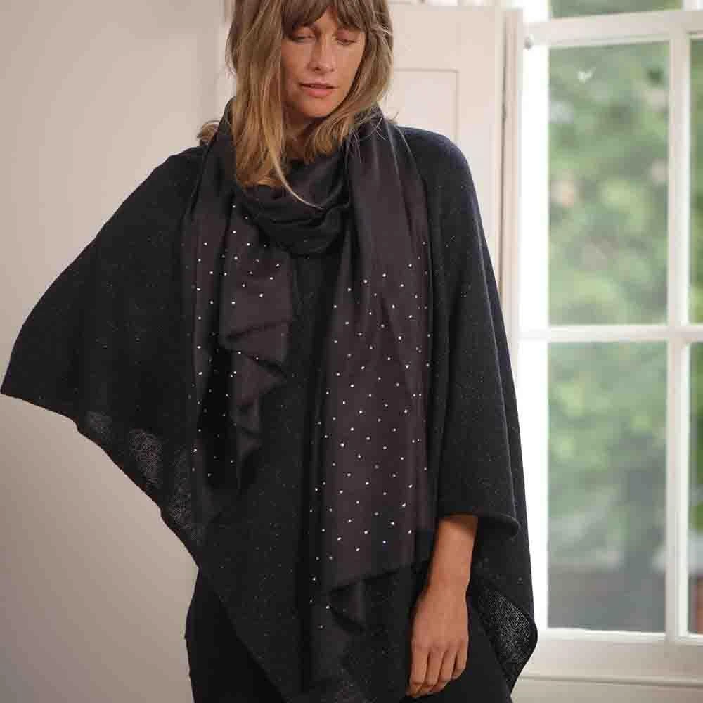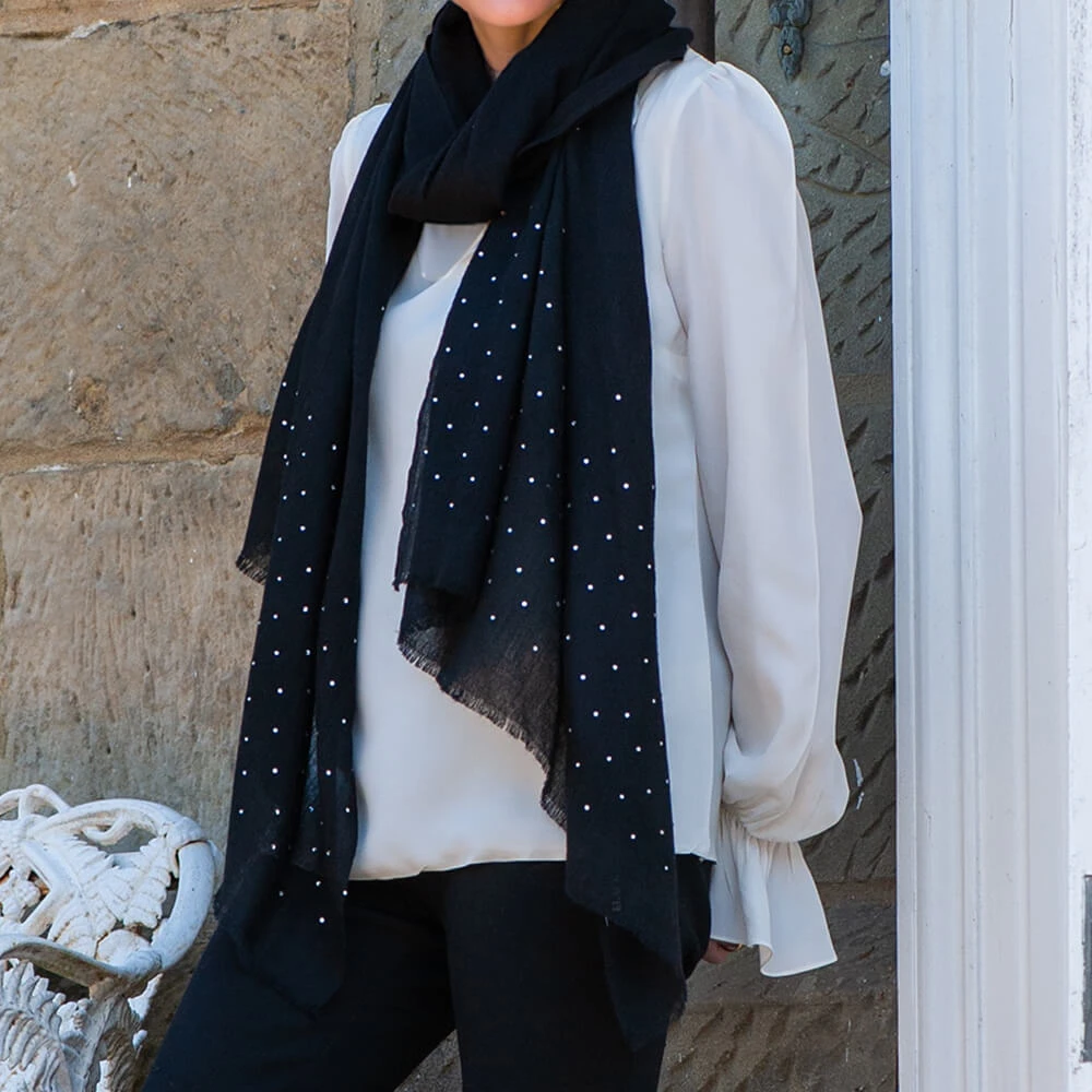 Elegant and flattering this swarovski crystal cashmere and silk black wrap adds a sparkle to evening and day wear alike. Soft to the touch it is richly embellished with fine Swarovski crystals densely scattered at both ends and more finely scattered in the centre. It drapes beautifully as a scarf or evening shawl.