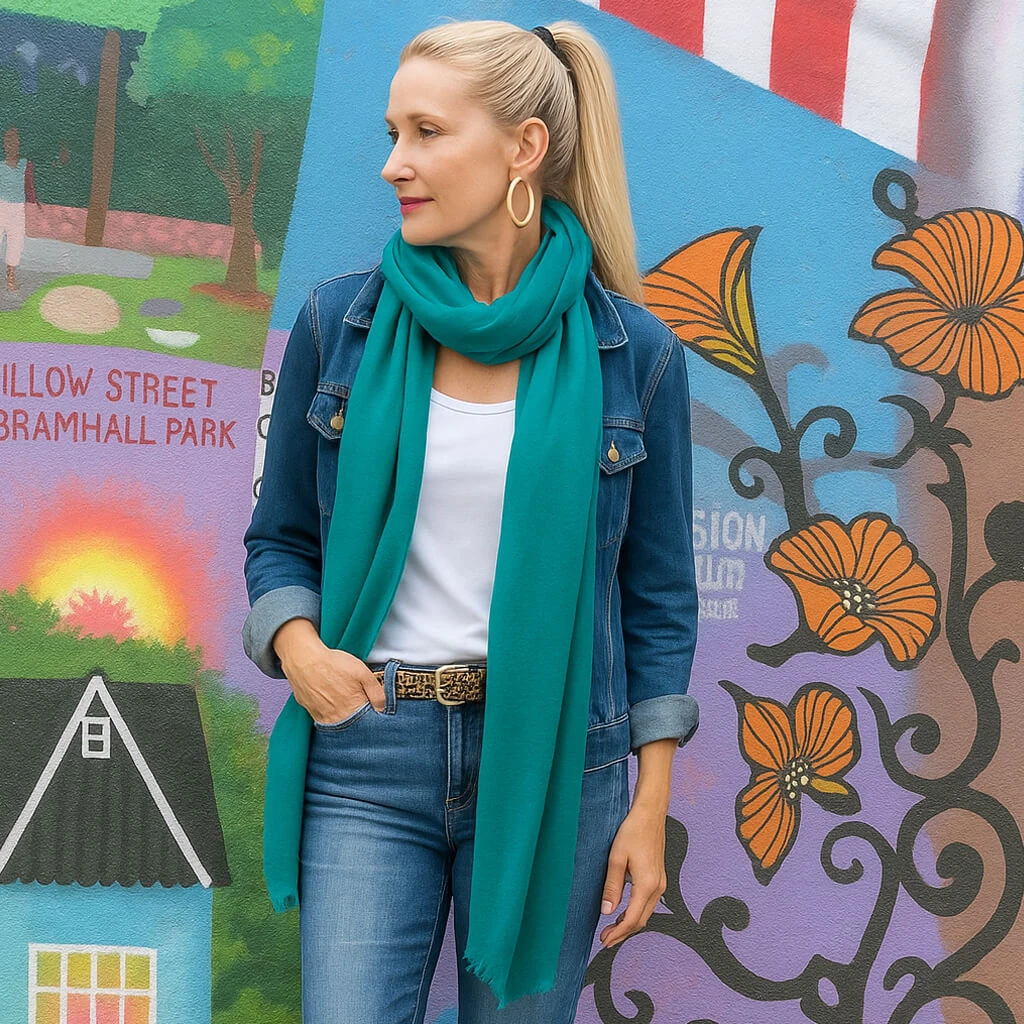 The depth of colour in this teal green cashmere and silk wrap gives it a rich vibrant impact. Crafted from a clever blend of two luxurious natural fibres, this generously sized wrap drapes elegantly as a scarf and shawl. Soft to the touch it is light and easy to wear all year round.