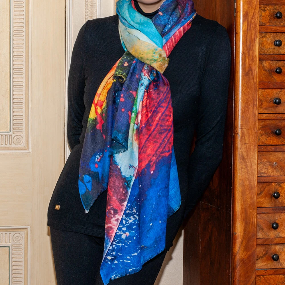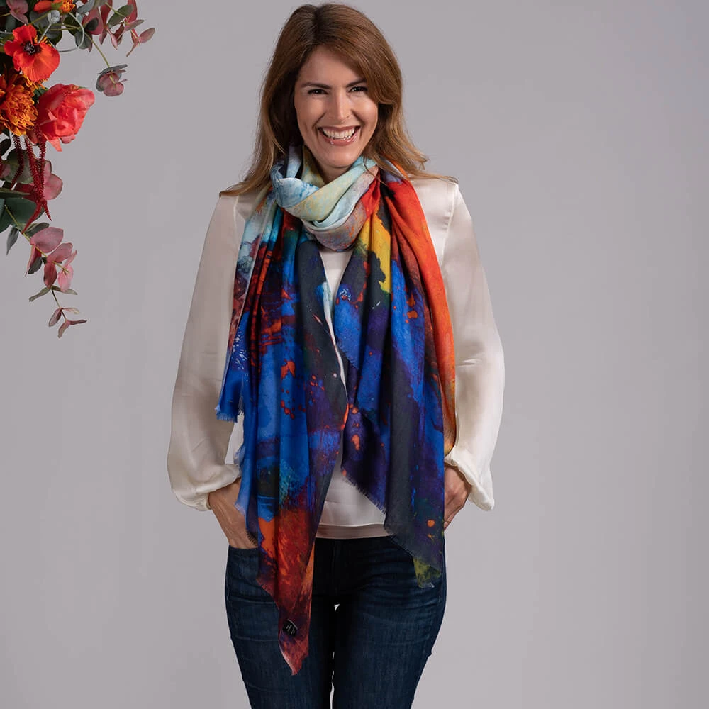 Sunblaze depicts the heat of the blazing sun burning strongly and brightly in vivid tones of reds and blue accented with softer tones shadows Expertly crafted from a clever blend of cashmere and silk the wrap is soft to the touch, light and warm and a perfect year round wrap which drapes elegantly. Generously sized at 200 x 70cm