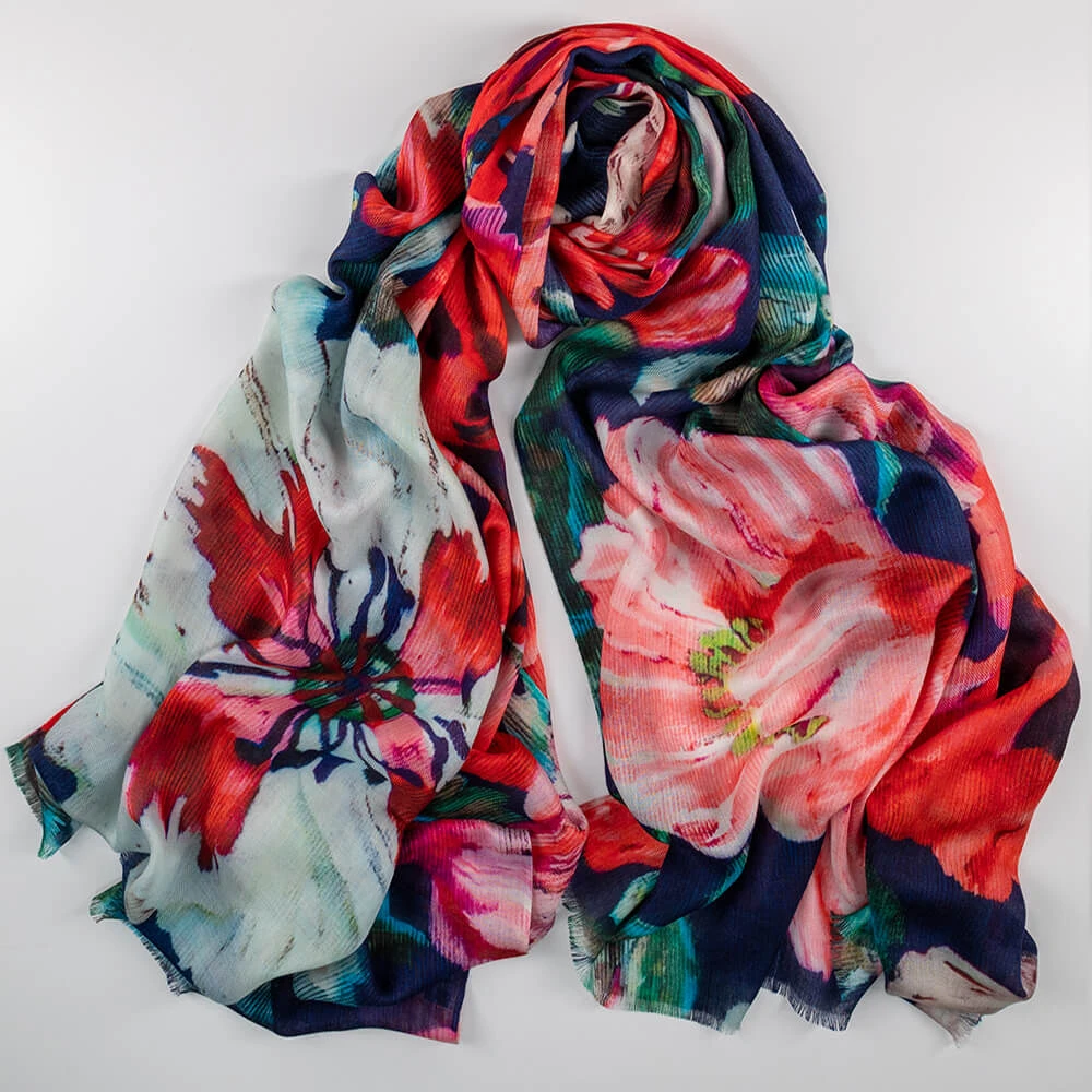 Dancing Poppies was inspired by the vibrant floral paintings by artist and botanist Cedric Morris, an accomplished colourist, plantsman and poppy seeder, who influenced many gardeners. Our close up interpretation of the original Liberty print shows the detailing of the poppies. Crafted from a clever blend of cashmere and silk it is soft, warm, light weight and generously sized. It drapes effortlessly and is large enough to wear as a shawl.