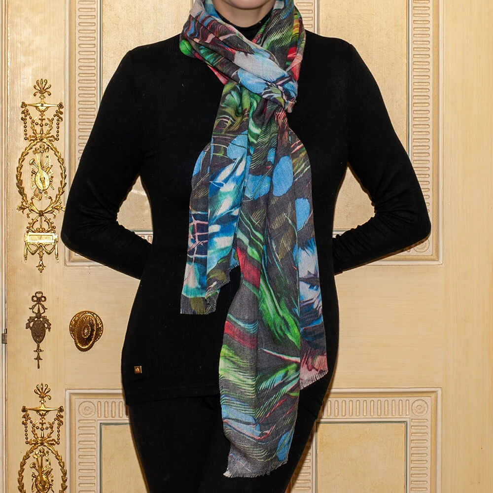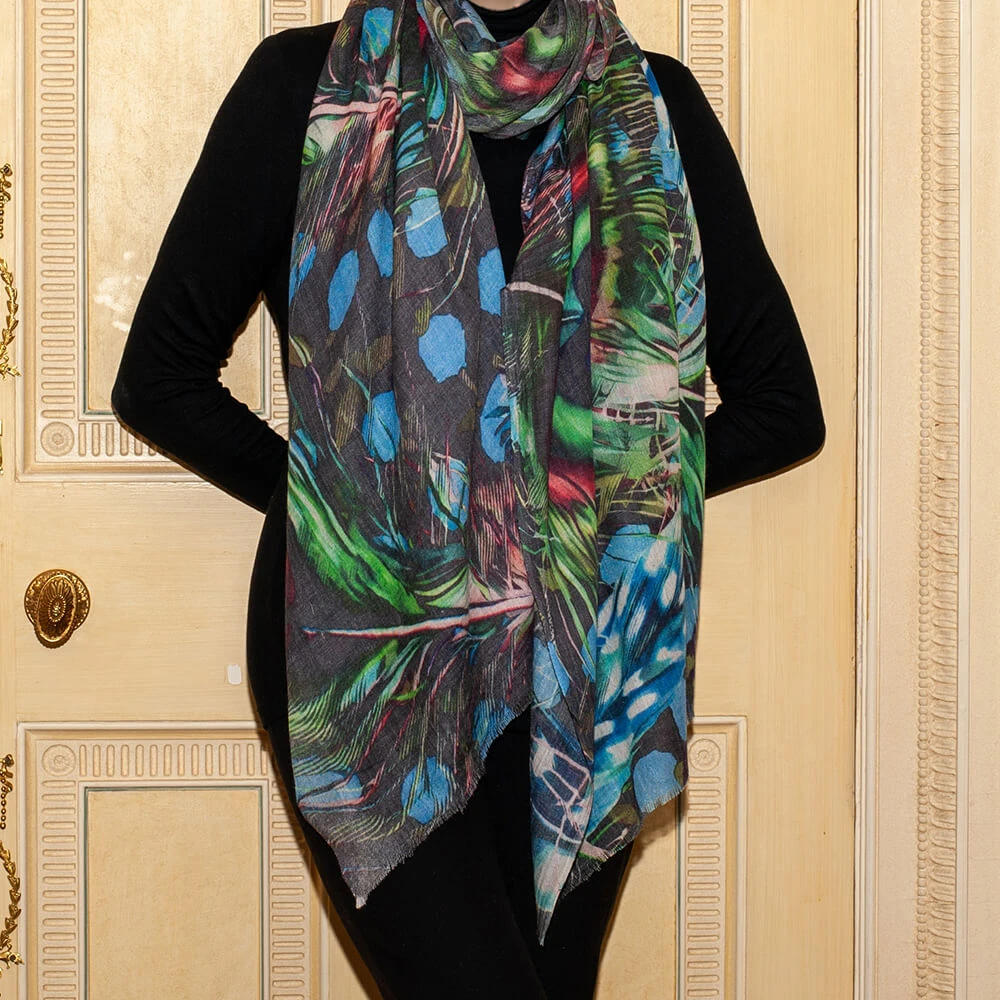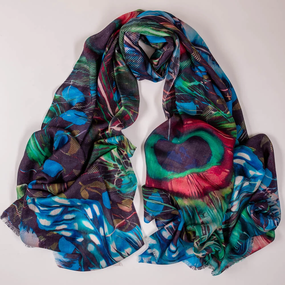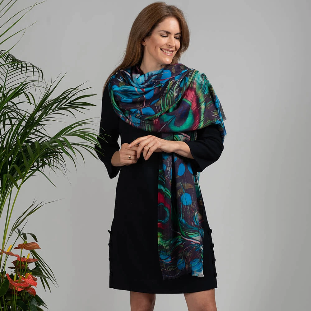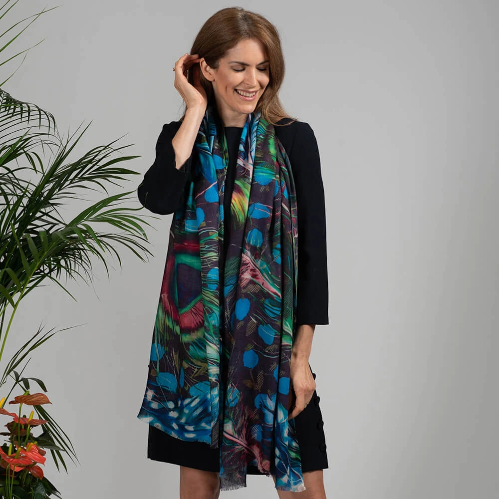 The Peacock cashmere and silk wrap is taken from an intricate peacock painting superimposed over a classic berry motif. We have amplified the original design to create a flourish of peacock feathers in a vibrant, dynamic interpretation. Crafted from a clever blend of cashmere and silk it is soft, warm, light and generously sized. It drapes effortlessly and is large enough to wear as a shawl.