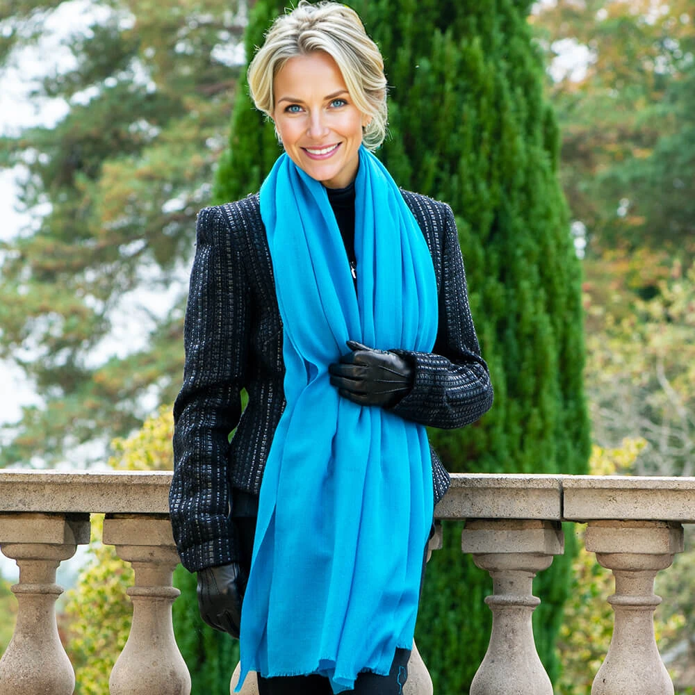 Vivid turquoise, December’s Birthstone, represents good fortune, protection and strength, and symbolises tranquillity and emotional balance as it was said to calm the mind. These positive qualities are reflected in the brightness of this turquoise cashmere and silk wrap. Crafted from a luxurious blend of cashmere and silk, it is soft, light but warm and offers a fluid drape with a subtle sheen. Bright, joyful and uplifting this wrap is as spirited as it is soft.